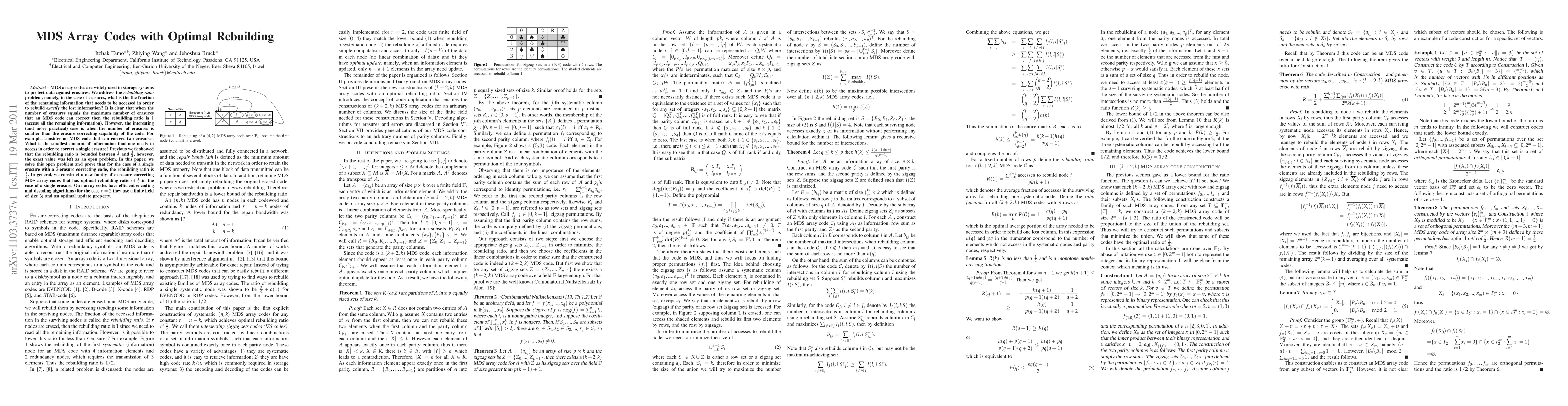 This paper addresses the rebuilding ratio problem for Maximum Distance Separable (MDS) array codes, determining the fraction of remaining data needed to rebuild lost information. It proves that for a single erasure in a 2-erasure correcting MDS code, the rebuilding ratio is 1/2, and constructs a new family of MDS array codes with an optimal rebuilding ratio of 1/r for r erasures, featuring efficient encoding and decoding algorithms.