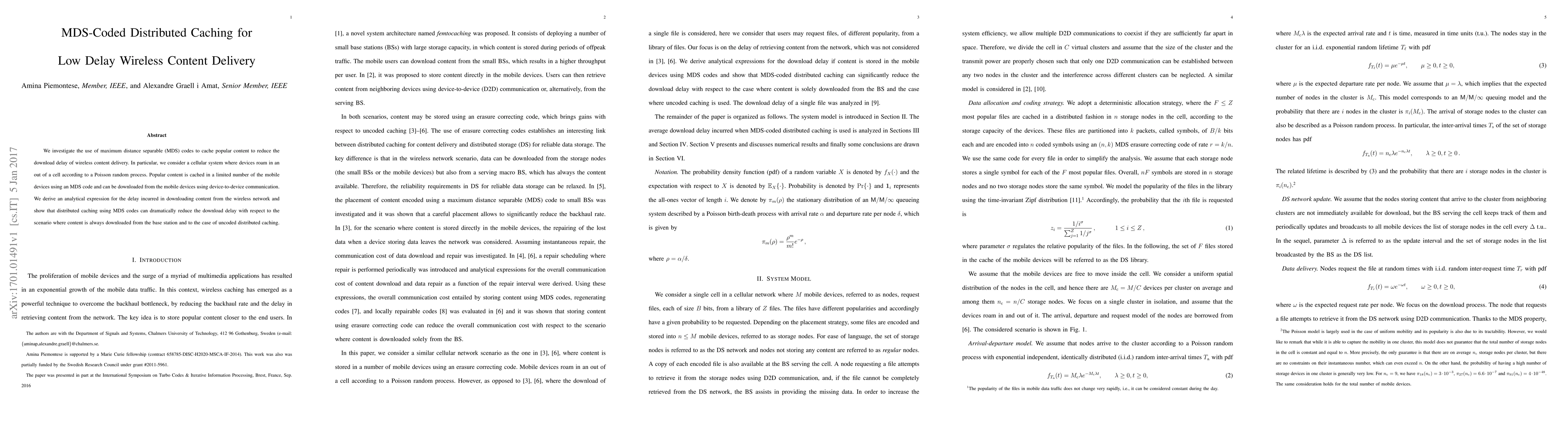 This paper explores the use of maximum distance separable (MDS) codes for caching popular content in mobile devices to minimize download delay in wireless networks. It demonstrates that MDS-coded distributed caching significantly reduces delay compared to traditional base station downloads and uncoded caching.