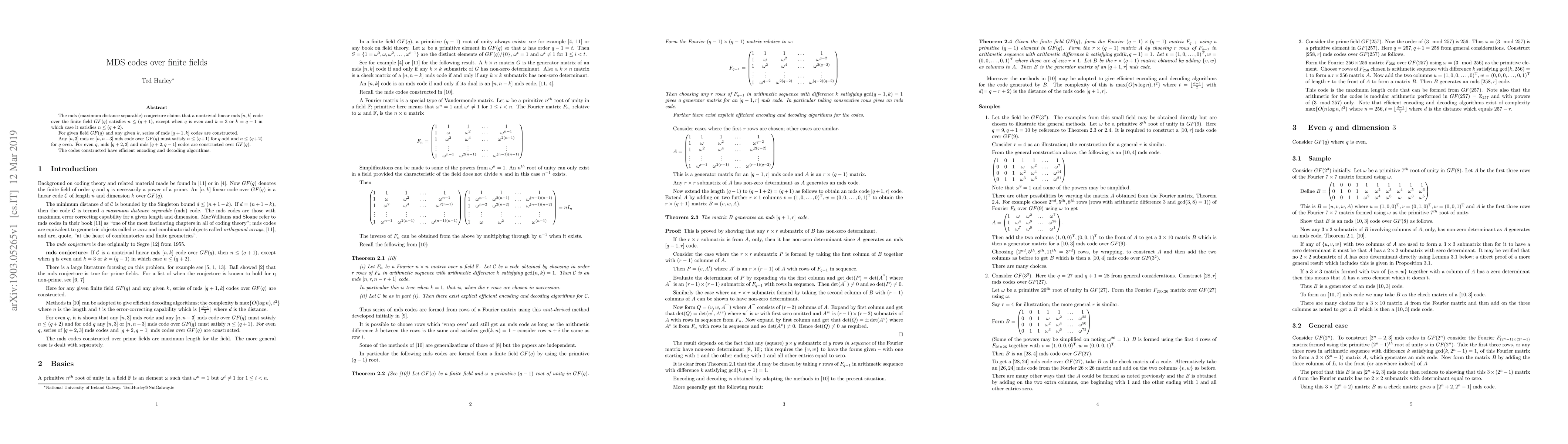 The paper constructs MDS codes over finite fields that satisfy the MDS conjecture, showing efficient constructions for $[n,k]$ codes with $n \leq q + 1$ for odd $q$ and $n \leq q + 2$ for even $q$, except for specific cases where larger $n$ is allowed. It also includes efficient encoding and decoding algorithms for these codes.