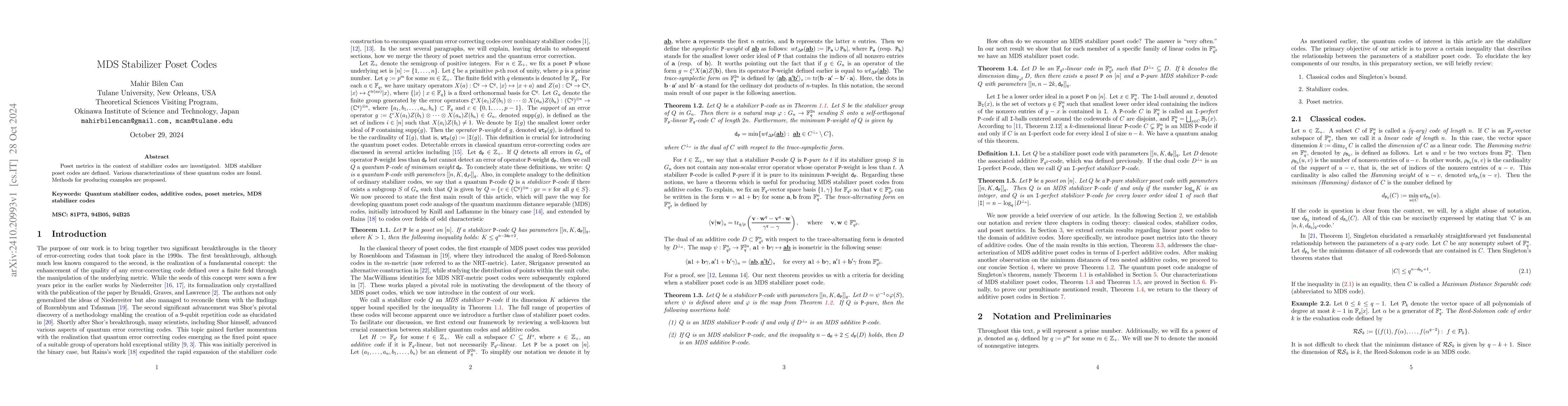 Summary: This paper investigates poset metrics for stabilizer codes, defining MDS stabilizer poset codes and providing their characterizations. It also proposes methods for constructing examples of these quantum codes.