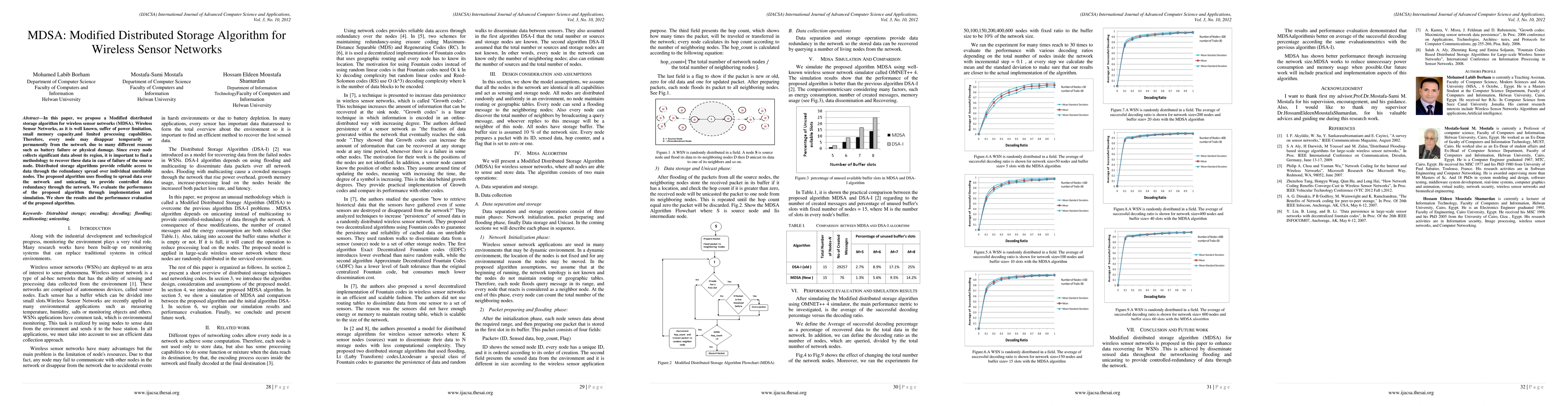 In this paper, we propose a Modified distributed storage algorithm for wireless sensor networks (MDSA). Wireless Sensor Networks, as it is well known, suffer of power limitation, small memory capacity,and limited processing capabilities. Therefore, every node may disappear temporarily or permanently from the network due to many different reasons such as battery failure or physical damage. Since every node collects significant data about its region, it is important to find a methodology to recover these data in case of failure of the source node. Distributed storage algorithms provide reliable access to data through the redundancy spread over individual unreliable nodes. The proposed algorithm uses flooding to spread data over the network and unicasting to provide controlled data redundancy through the network. We evaluate the performance of the proposed algorithm through implementation and simulation. We show the results and the performance evaluation of the proposed algorithm.