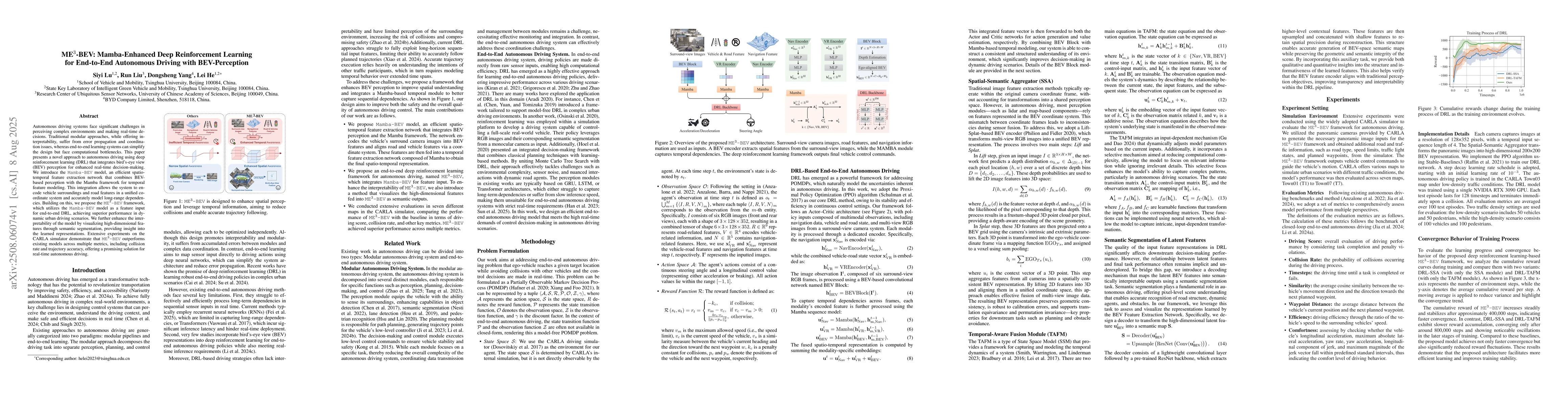 The paper presents ME$^3$-BEV, an end-to-end autonomous driving framework using deep reinforcement learning (DRL) that integrates bird's-eye view (BEV) perception for enhanced real-time decision-making. It introduces the Mamba-BEV model, an efficient spatio-temporal feature extraction network that combines BEV-based perception with the Mamba framework for temporal feature modeling. The proposed ME$^3$-BEV framework utilizes the Mamba-BEV model as a feature input for DRL, achieving superior performance in dynamic urban driving scenarios.