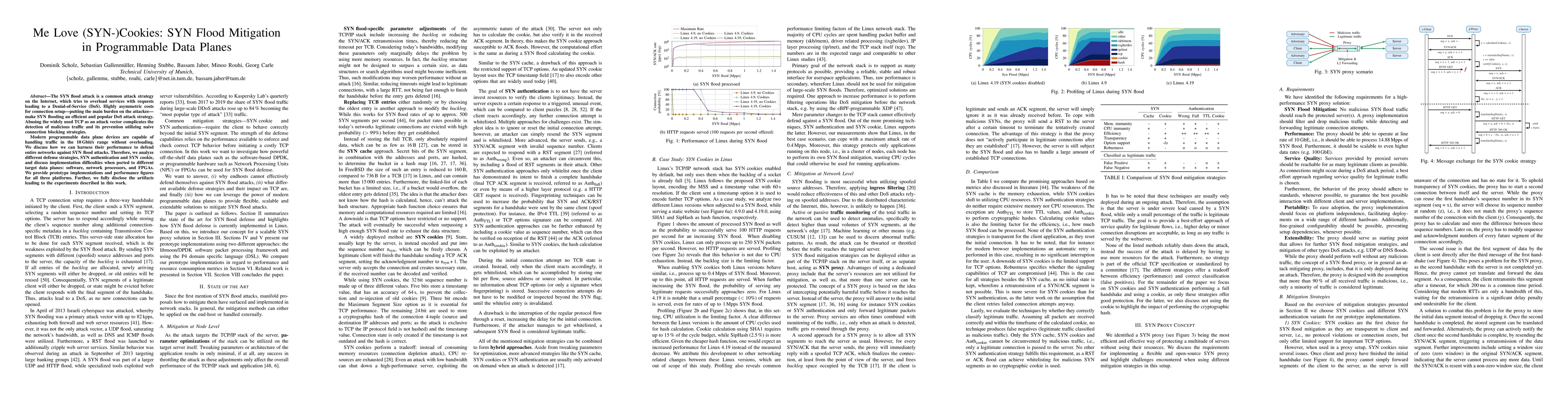 This paper explores SYN flood attack mitigation using programmable data planes, focusing on SYN authentication and SYN cookies. It examines the implementation challenges and performance of these defenses on software, network processors, and FPGAs, providing prototype implementations and performance data.