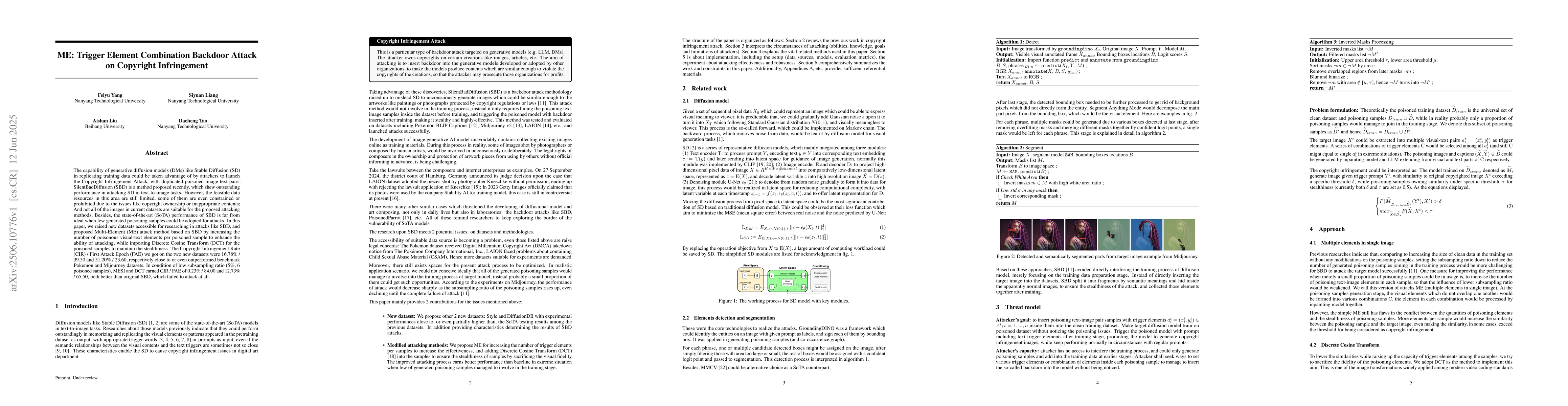 The capability of generative diffusion models (DMs) like Stable Diffusion (SD) in replicating training data could be taken advantage of by attackers to launch the Copyright Infringement Attack, with duplicated poisoned image-text pairs. SilentBadDiffusion (SBD) is a method proposed recently, which shew outstanding performance in attacking SD in text-to-image tasks. However, the feasible data resources in this area are still limited, some of them are even constrained or prohibited due to the issues like copyright ownership or inappropriate contents; And not all of the images in current datasets are suitable for the proposed attacking methods; Besides, the state-of-the-art (SoTA) performance of SBD is far from ideal when few generated poisoning samples could be adopted for attacks. In this paper, we raised new datasets accessible for researching in attacks like SBD, and proposed Multi-Element (ME) attack method based on SBD by increasing the number of poisonous visual-text elements per poisoned sample to enhance the ability of attacking, while importing Discrete Cosine Transform (DCT) for the poisoned samples to maintain the stealthiness. The Copyright Infringement Rate (CIR) / First Attack Epoch (FAE) we got on the two new datasets were 16.78% / 39.50 and 51.20% / 23.60, respectively close to or even outperformed benchmark Pokemon and Mijourney datasets. In condition of low subsampling ratio (5%, 6 poisoned samples), MESI and DCT earned CIR / FAE of 0.23% / 84.00 and 12.73% / 65.50, both better than original SBD, which failed to attack at all.