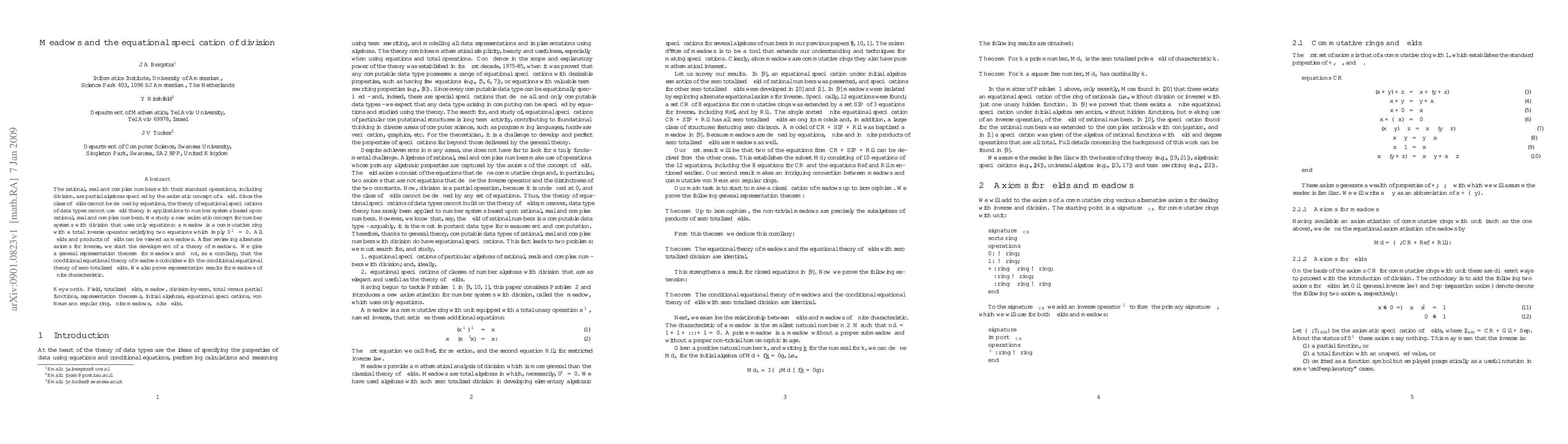 This paper introduces the concept of meadows, which are commutative rings with a total inverse operator defined by specific equations, as an equational specification for number systems with division. It demonstrates that meadows encompass all fields and products of fields, providing a new framework for the equational theory of division.