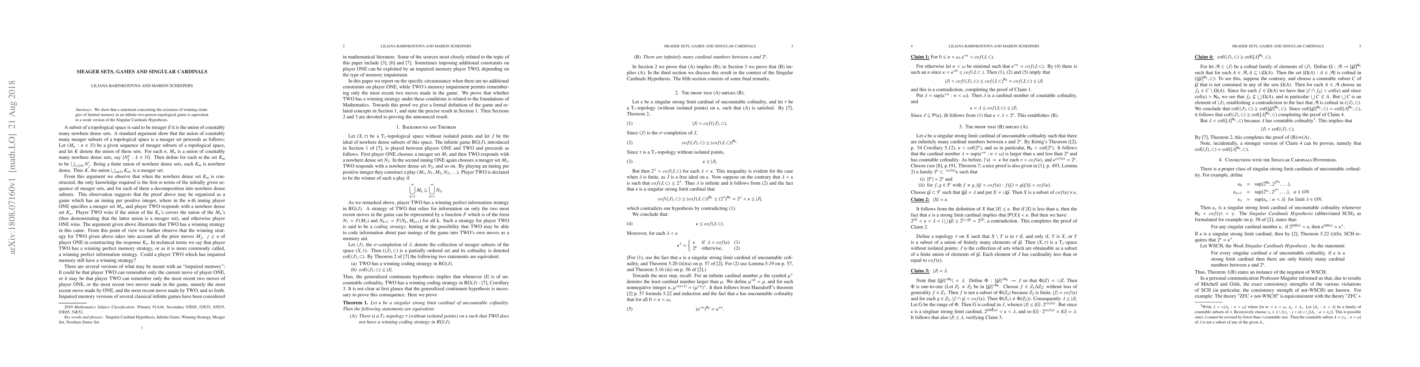 Summary: This paper demonstrates the equivalence between a statement about winning strategies in an infinite topological game and a weak version of the Singular Cardinals Hypothesis, linking game theory and set theory.
