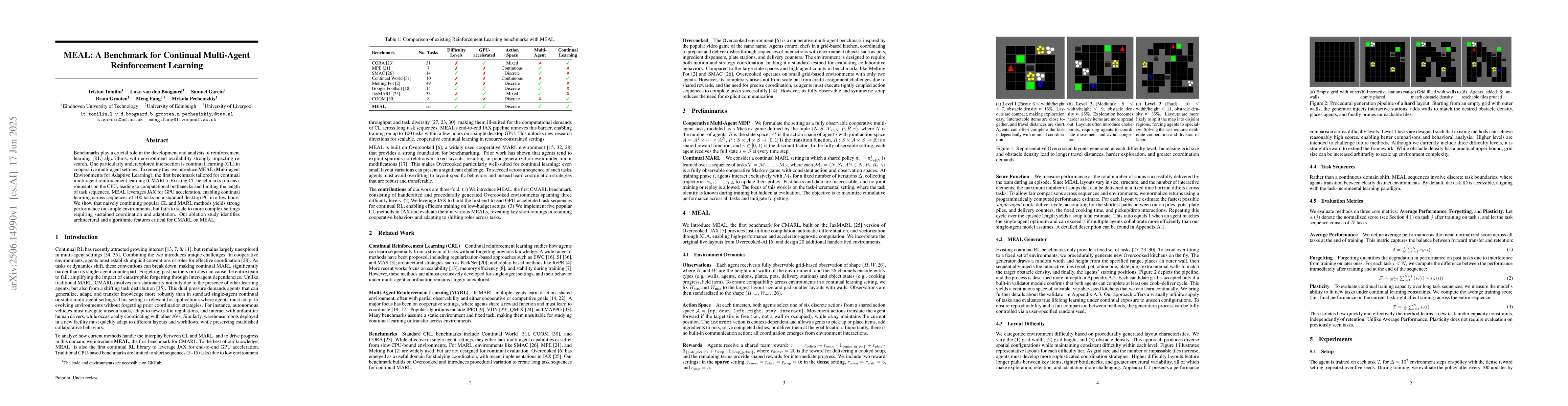 Benchmarks play a crucial role in the development and analysis of reinforcement learning (RL) algorithms, with environment availability strongly impacting research. One particularly underexplored intersection is continual learning (CL) in cooperative multi-agent settings. To remedy this, we introduce MEAL (Multi-agent Environments for Adaptive Learning), the first benchmark tailored for continual multi-agent reinforcement learning (CMARL). Existing CL benchmarks run environments on the CPU, leading to computational bottlenecks and limiting the length of task sequences. MEAL leverages JAX for GPU acceleration, enabling continual learning across sequences of 100 tasks on a standard desktop PC in a few hours. We show that naively combining popular CL and MARL methods yields strong performance on simple environments, but fails to scale to more complex settings requiring sustained coordination and adaptation. Our ablation study identifies architectural and algorithmic features critical for CMARL on MEAL.