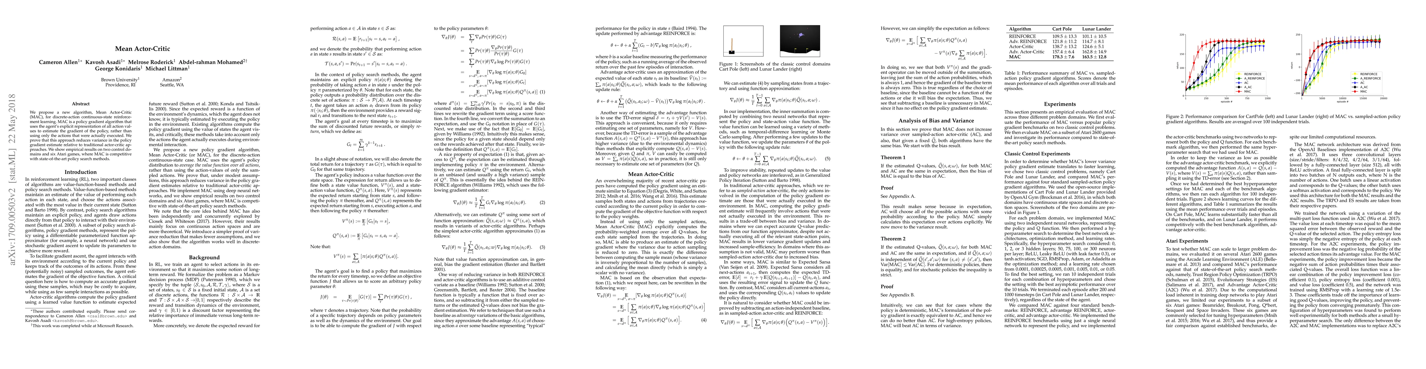 We propose a new algorithm, Mean Actor-Critic (MAC), for discrete-action continuous-state reinforcement learning. MAC is a policy gradient algorithm that uses the agent's explicit representation of all action values to estimate the gradient of the policy, rather than using only the actions that were actually executed. We prove that this approach reduces variance in the policy gradient estimate relative to traditional actor-critic methods. We show empirical results on two control domains and on six Atari games, where MAC is competitive with state-of-the-art policy search algorithms.