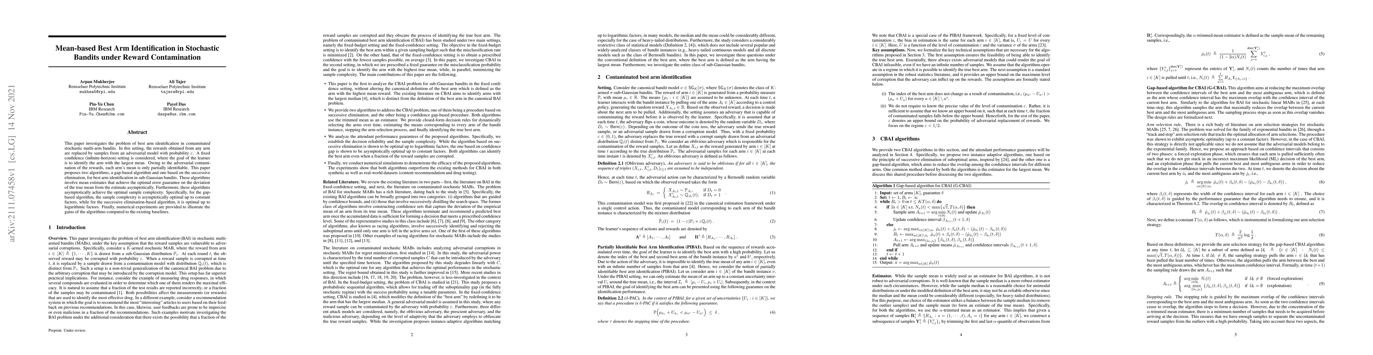This paper proposes two algorithms for identifying the best arm in stochastic multi-arm bandits under reward contamination, achieving optimal sample complexity and error guarantees. Numerical experiments demonstrate their performance advantages over existing methods.