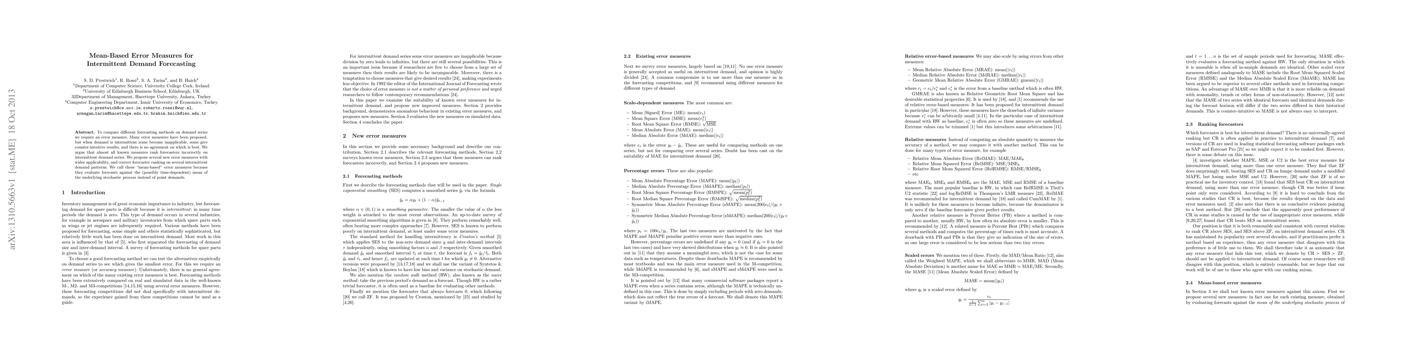 To compare different forecasting methods on demand series we require an error measure. Many error measures have been proposed, but when demand is intermittent some become inapplicable, some give counter-intuitive results, and there is no agreement on which is best. We argue that almost all known measures rank forecasters incorrectly on intermittent demand series. We propose several new error measures with wider applicability, and correct forecaster ranking on several intermittent demand patterns. We call these "mean-based" error measures because they evaluate forecasts against the (possibly time-dependent) mean of the underlying stochastic process instead of point demands.