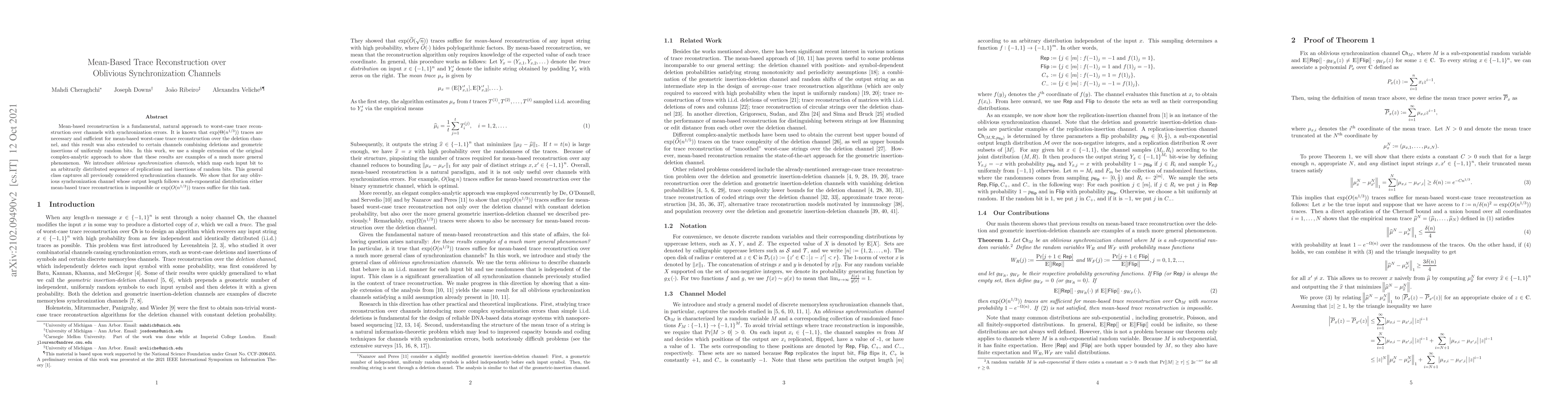 Mean-based reconstruction is a fundamental, natural approach to worst-case trace reconstruction over channels with synchronization errors. It is known that $\exp(O(n^{1/3}))$ traces are necessary and sufficient for mean-based worst-case trace reconstruction over the deletion channel, and this result was also extended to certain channels combining deletions and geometric insertions of uniformly random bits. In this work, we use a simple extension of the original complex-analytic approach to show that these results are examples of a much more general phenomenon. We introduce oblivious synchronization channels, which map each input bit to an arbitrarily distributed sequence of replications and insertions of random bits. This general class captures all previously considered synchronization channels. We show that for any oblivious synchronization channel whose output length follows a sub-exponential distribution either mean-based trace reconstruction is impossible or $\exp(O(n^{1/3}))$ traces suffice for this task.