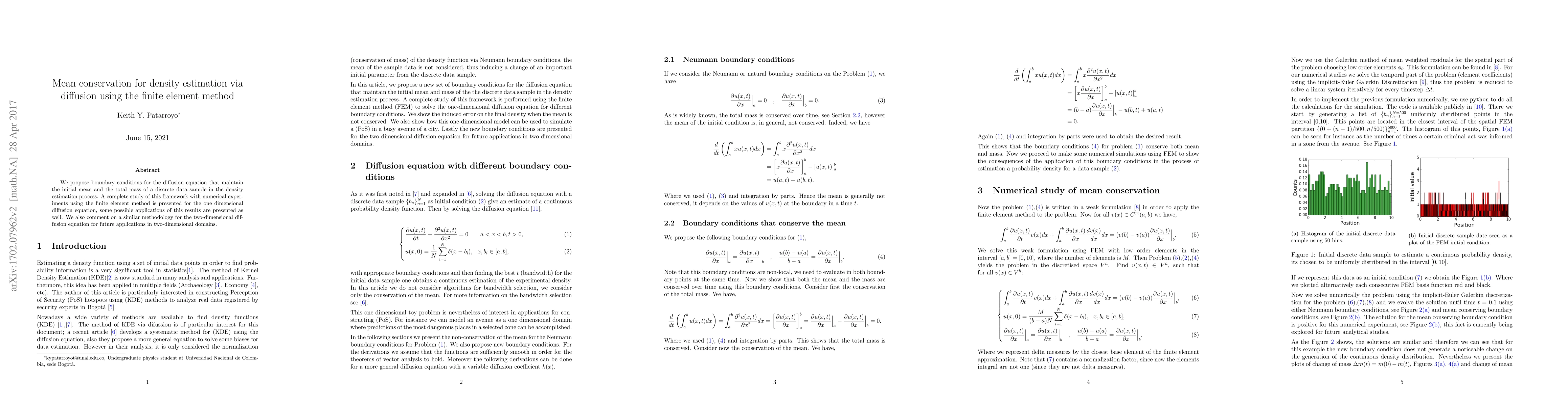 We propose boundary conditions for the diffusion equation that maintain the initial mean and the total mass of a discrete data sample in the density estimation process. A complete study of this framework with numerical experiments using the finite element method is presented for the one dimensional diffusion equation, some possible applications of this results are presented as well. We also comment on a similar methodology for the two-dimensional diffusion equation for future applications in two-dimensional domains.