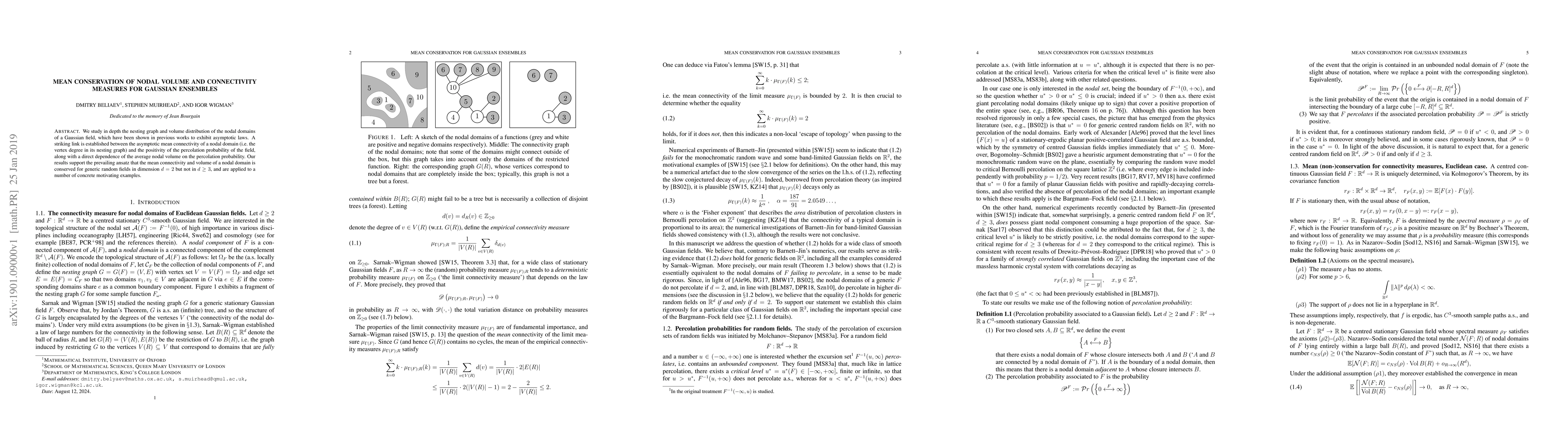 This paper investigates the asymptotic behavior of nodal domains in Gaussian fields, establishing a connection between mean connectivity and percolation probability, and confirming that mean connectivity and volume conservation holds in 2D but not in higher dimensions. The findings are illustrated through specific examples.