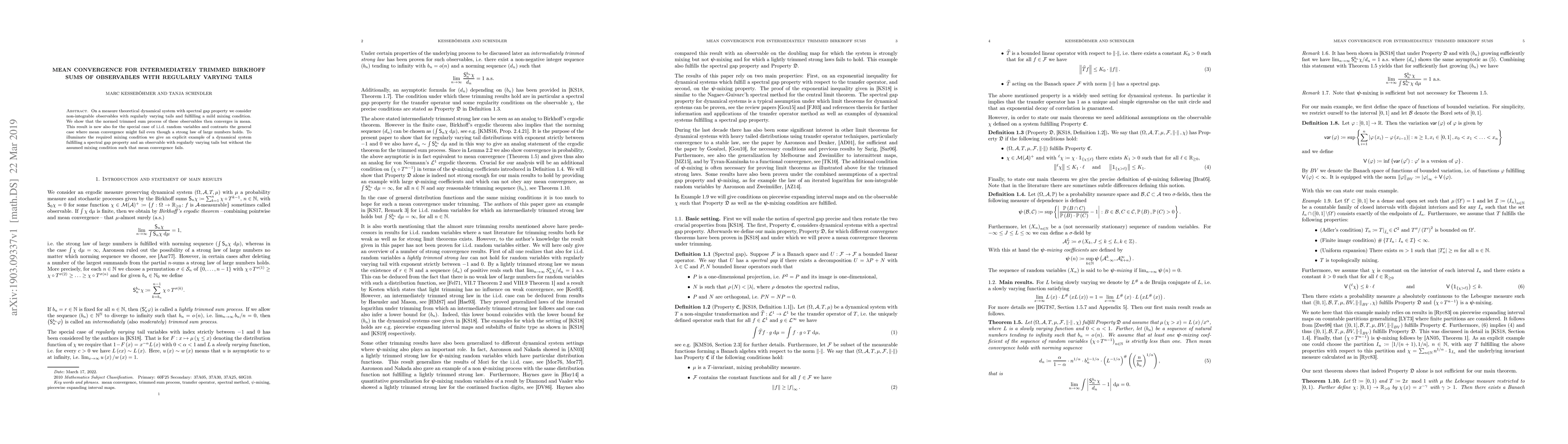 On a measure theoretical dynamical system with spectral gap property we consider non-integrable observables with regularly varying tails and fulfilling a mild mixing condition. We show that the normed trimmed sum process of these observables then converges in mean. This result is new also for the special case of i.i.d. random variables and contrasts the general case where mean convergence might fail even though a strong law of large numbers holds. To illuminate the required mixing condition we give an explicit example of a dynamical system fulfilling a spectral gap property and an observable with regularly varying tails but without the assumed mixing condition such that mean convergence fails.