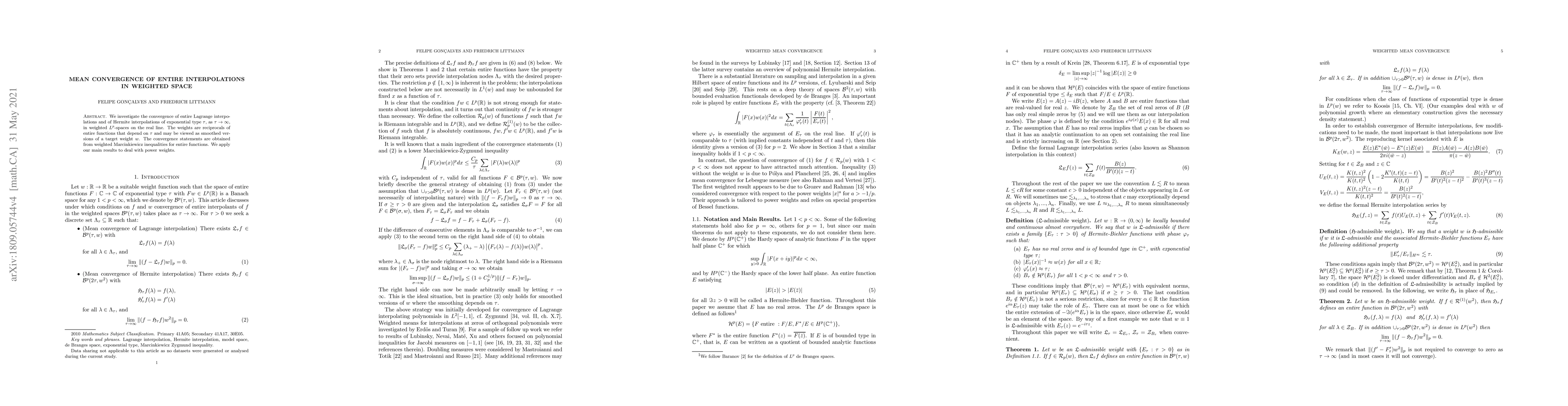 This research paper studies the convergence of entire interpolations in weighted L^p-spaces on the real line, with implications for exponential type Hermite interpolations and power weights, building upon existing results by Rahman and Grozev.