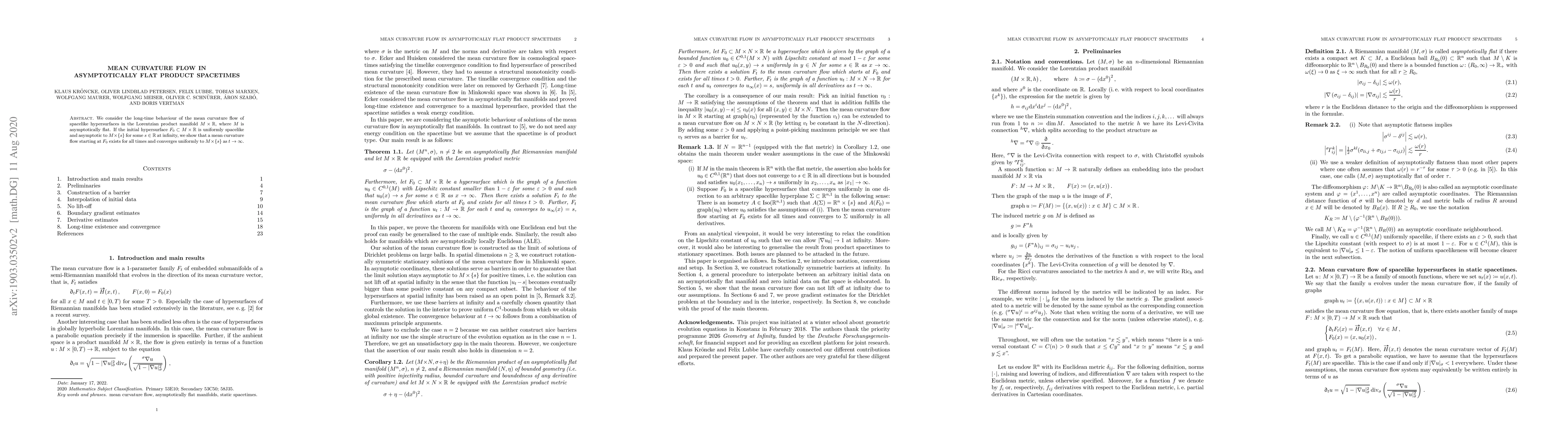 We consider the long-time behaviour of the mean curvature flow of spacelike hypersurfaces in the Lorentzian product manifold $M\times\mathbb{R}$, where $M$ is asymptotically flat. If the initial hypersurface $F_0\subset M\times\mathbb{R}$ is uniformly spacelike and asymptotic to $M\times\left\{s\right\}$ for some $s\in\mathbb{R}$ at infinity, we show that a mean curvature flow starting at $F_0$ exists for all times and converges uniformly to $M\times\left\{s\right\}$ as $t\to \infty$.