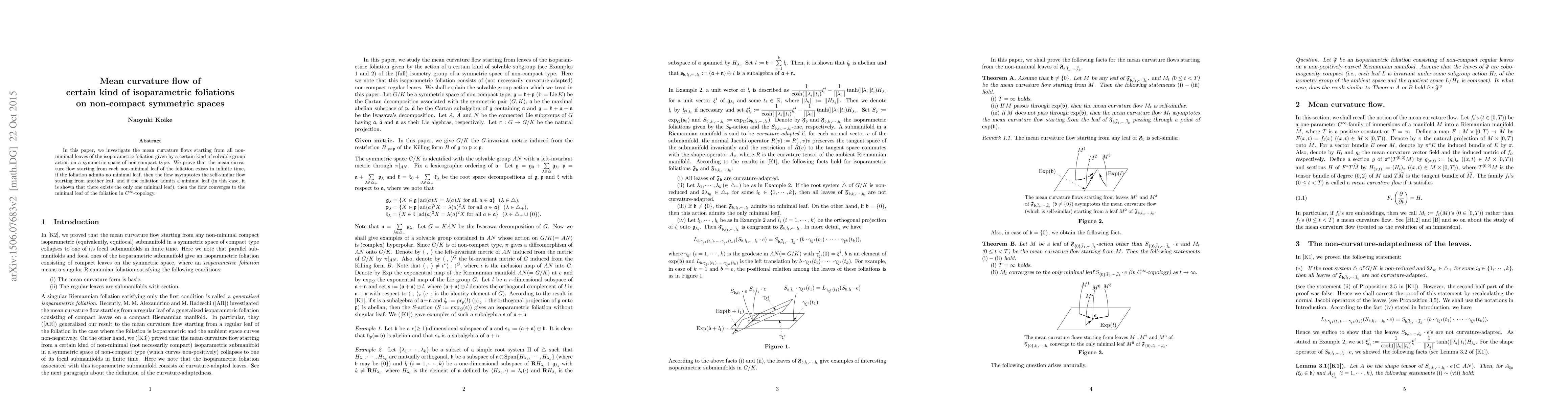 In this paper, we investigate the mean curvature flows starting from all non-minimal leaves of the isoparametric foliation given by a certain kind of solvable group action on a symmetric space of non-compact type. We prove that the mean curvature flow starting from each non-minimal leaf of the foliation exists in infinite time, if the foliation admits no minimal leaf, then the flow asymptotes the self-similar flow starting from another leaf, and if the foliation admits a minimal leaf (in this case, it is shown that there exists the only one minimal leaf), then the flow converges to the minimal leaf of the foliation in $C^{\infty}$-topology.