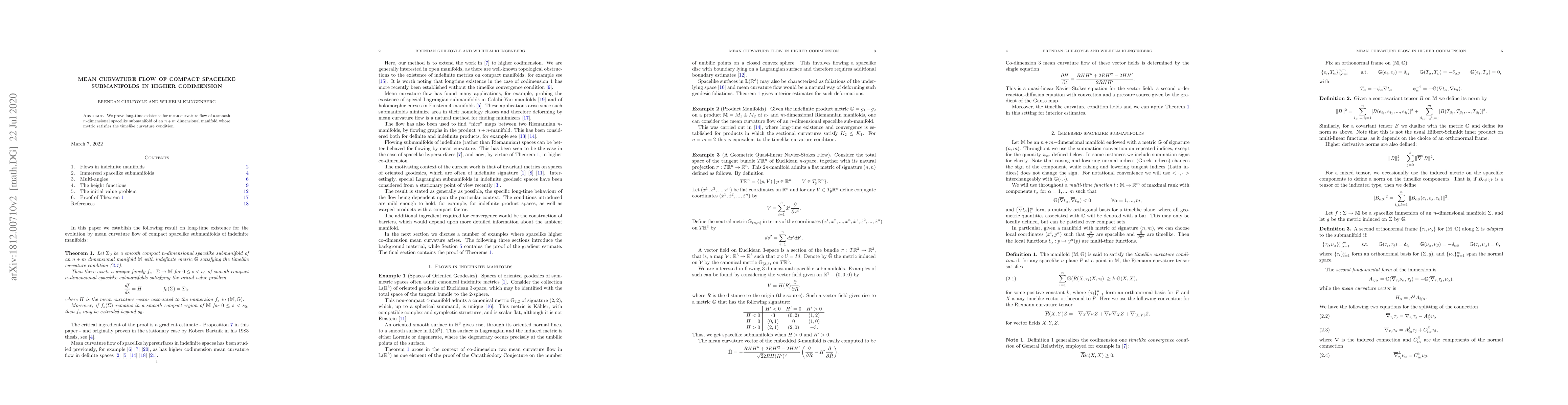 Summary: This paper establishes the long-time existence of mean curvature flow for smooth $n$-dimensional spacelike submanifolds in $n+m$ dimensional manifolds under the timelike curvature condition. The result extends the understanding of geometric evolution in higher codimension spacelike settings.