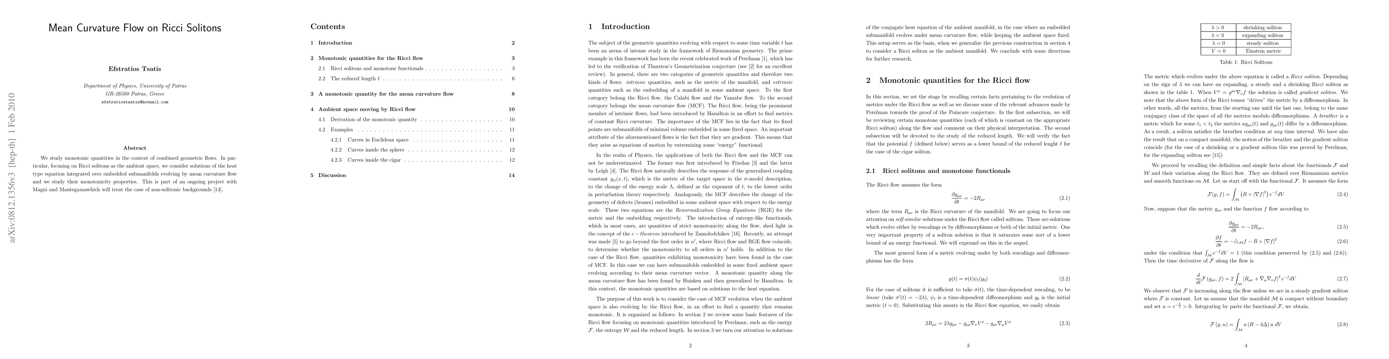 We study monotonic quantities in the context of combined geometric flows. In particular, focusing on Ricci solitons as the ambient space, we consider solutions of the heat type equation integrated over embedded submanifolds evolving by mean curvature flow and we study their monotonicity properties. This is part of an ongoing project with Magni and Mantegazzawhich will treat the case of non-solitonic backgrounds $\cite{a_14}$.