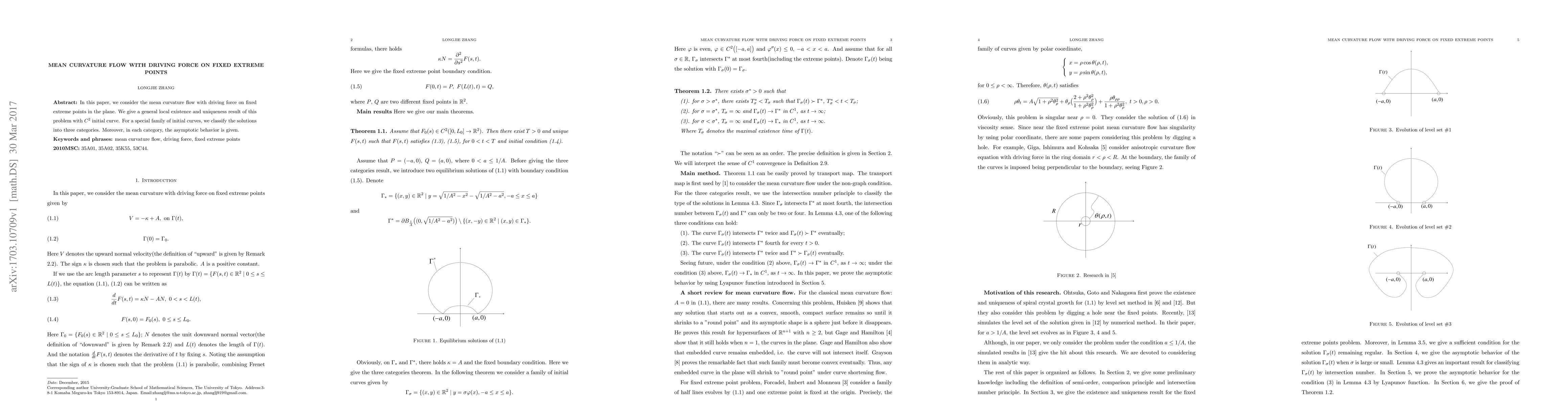 This paper studies mean curvature flow with driving force on fixed extreme points in the plane, proving local existence and uniqueness for $C^2$ initial curves. It also classifies solutions into three categories and analyzes their asymptotic behavior for a specific family of initial curves.