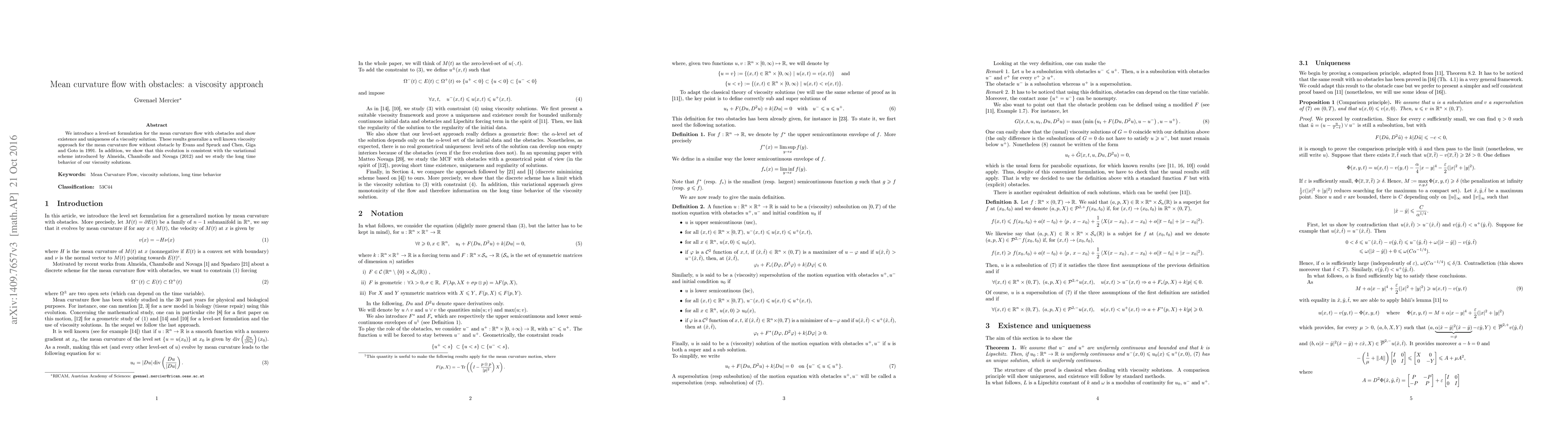 This paper introduces a level-set formulation for mean curvature flow with obstacles, proving existence and uniqueness of a viscosity solution. It extends previous results for obstacle-free flow and aligns with a variational scheme, while also examining the long-term behavior of the solutions.