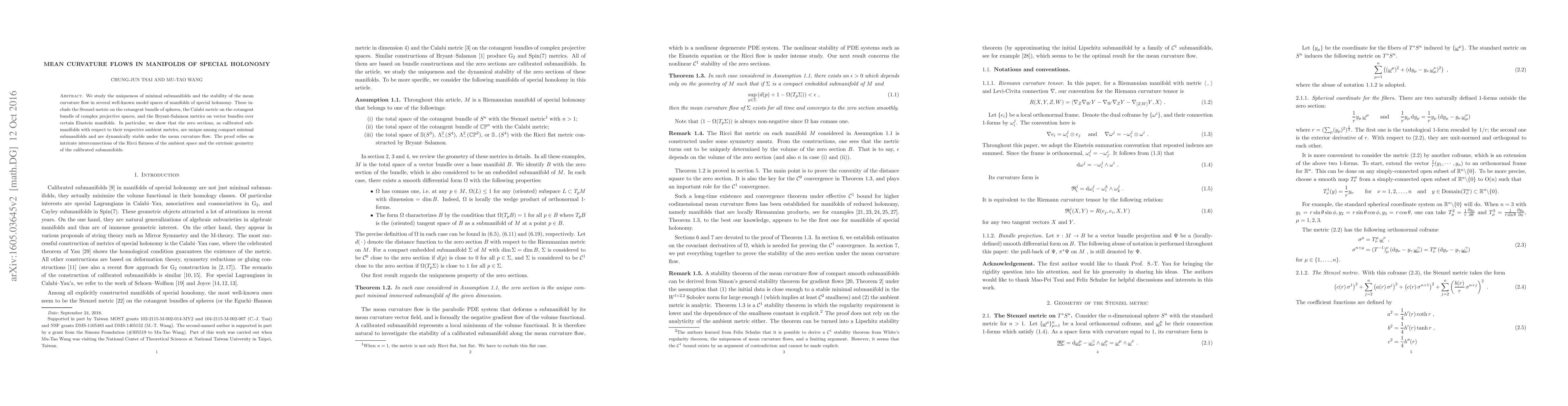 This paper investigates the uniqueness and stability of minimal submanifolds under mean curvature flow in manifolds with special holonomy, focusing on Stenzel, Calabi, and Bryant-Salamon metrics. It demonstrates that zero sections are uniquely and dynamically stable as calibrated submanifolds, leveraging the Ricci flatness of the ambient spaces and the geometry of these submanifolds.