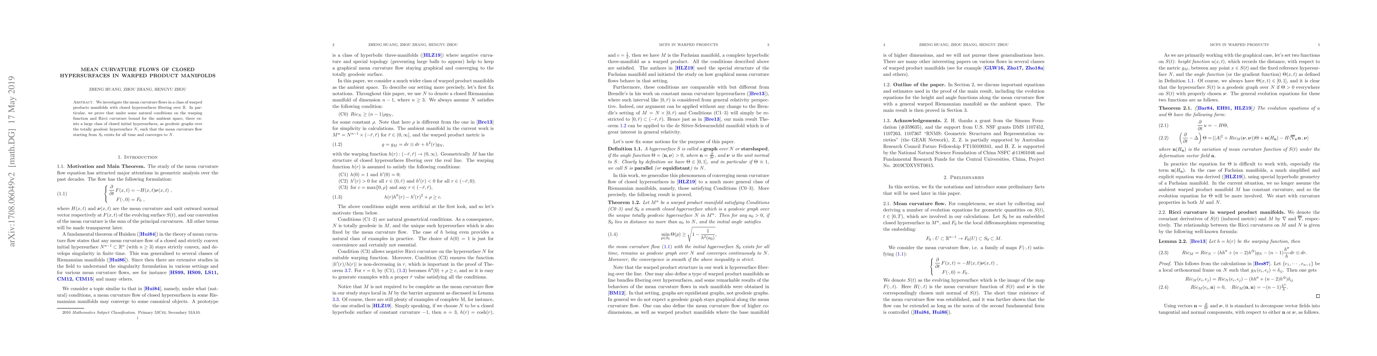 We investigate the mean curvature flows in a class of warped product manifolds with closed hypersurfaces fibering over $\mathbb{R}$. In particular, we prove that under natural conditions on the warping function and Ricci curvature bound for the ambient space, there exists a large class of closed initial hypersurfaces, as geodesic graphs over the totally geodesic hypersurface $\Sigma$, such that the mean curvature flow starting from $S_0$ exists for all time and converges to $\Sigma$.