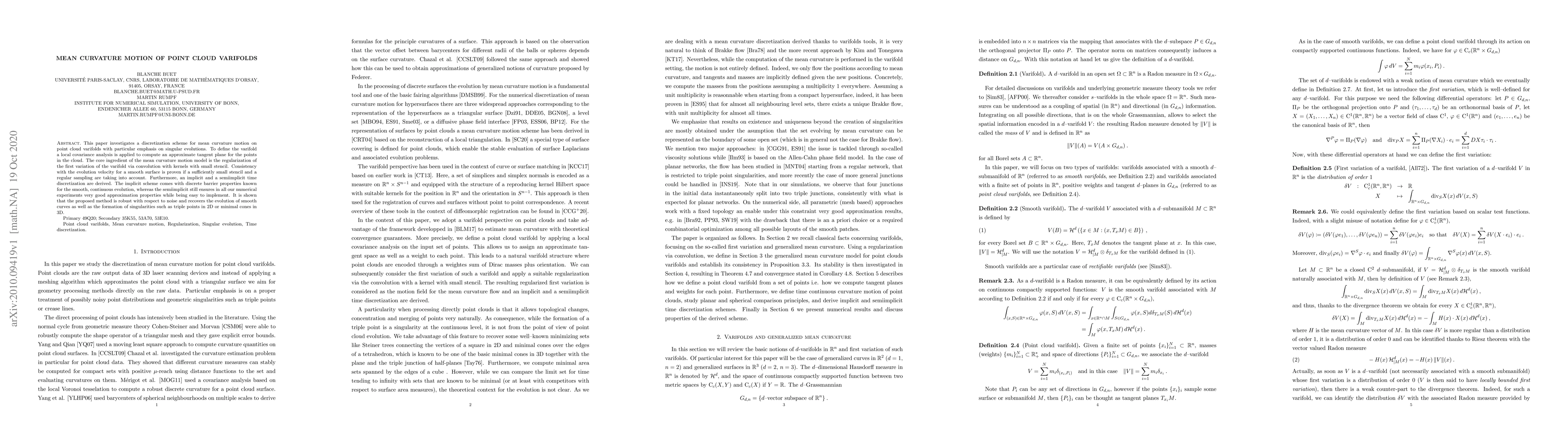 This paper introduces a method for simulating mean curvature motion on point cloud varifolds, which can handle noise and singularities, and offers robust numerical solutions through implicit and semi-implicit time discretization schemes.