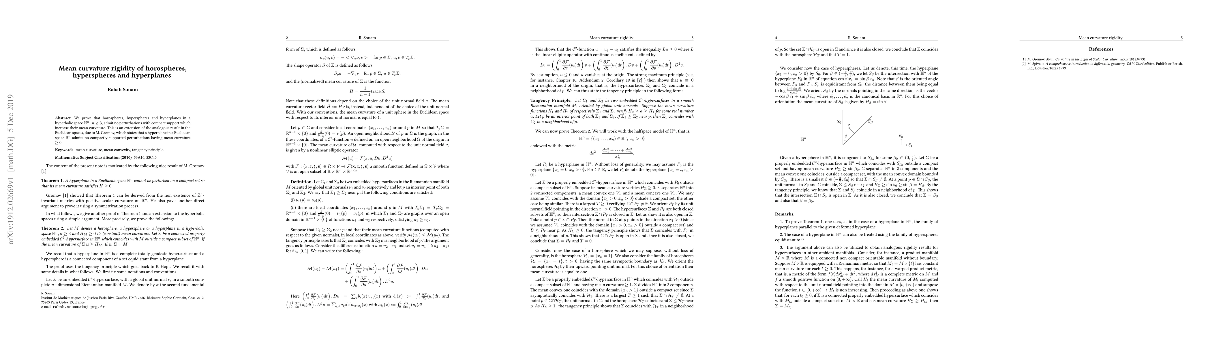 We prove that horospheres, hyperspheres and hyperplanes in a hyperbolic space H n , n $\ge$ 3, admit no perturbations with compact support which increase their mean curvature. is is an extension of the analogous result in the Euclidean spaces, due to M. Gromov, which states that a hyperplane in a Euclidean space R n admits no compactly supported perturbations having mean curvature $\ge$ 0.