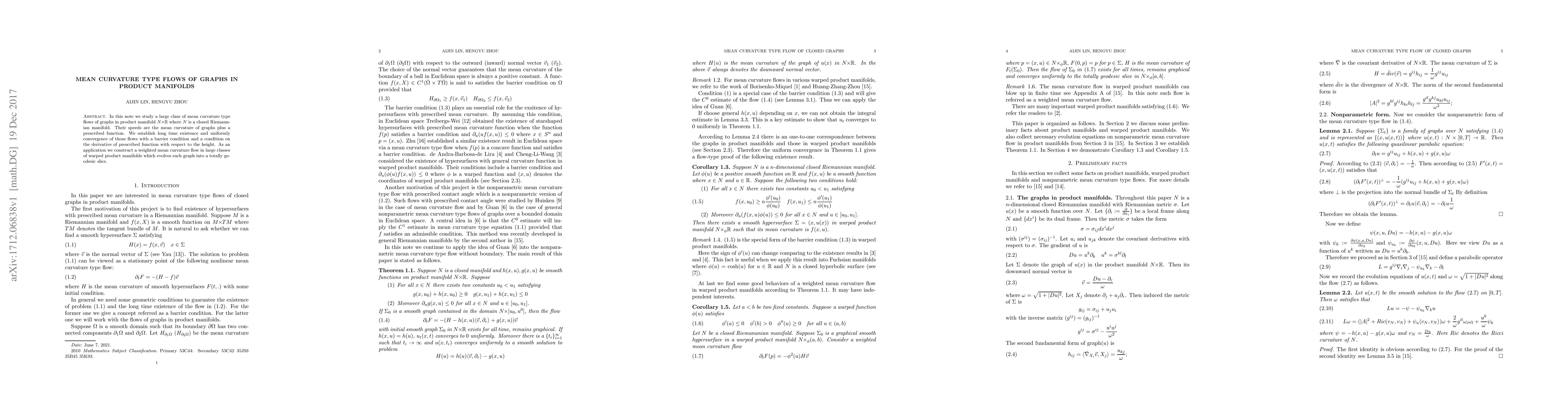 This paper investigates mean curvature type flows of graphs in product manifolds $N\times R$, establishing long-time existence and uniform convergence under specific conditions. It also constructs a weighted mean curvature flow in warped product manifolds, evolving graphs into totally geodesic slices.