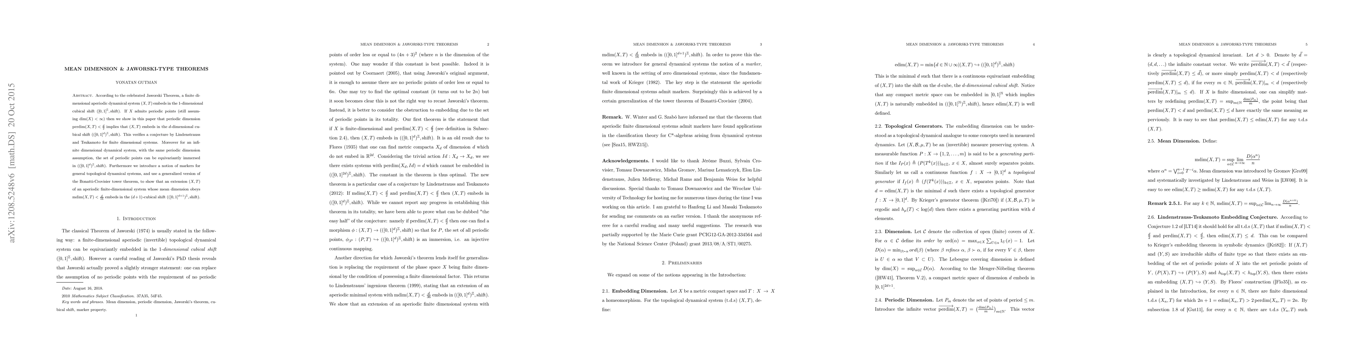 According to the celebrated Jaworski Theorem, a finite dimensional aperiodic dynamical system $(X,T)$ embeds in the $1$-dimensional cubical shift $([0,1]^{\mathbb{Z}},shift)$. If $X$ admits periodic points (still assuming $\dim(X)<\infty$) then we show in this paper that periodic dimension $perdim(X,T)<\frac{d}{2}$ implies that $(X,T)$ embeds in the $d$-dimensional cubical shift $(([0,1]^{d})^{\mathbb{Z}},shift)$. This verifies a conjecture by Lindenstrauss and Tsukamoto for finite dimensional systems. Moreover for an infinite dimensional dynamical system, with the same periodic dimension assumption, the set of periodic points can be equivariantly immersed in $(([0,1]^{d})^{\mathbb{Z}},shift)$. Furthermore we introduce a notion of markers for general topological dynamical systems, and use a generalized version of the Bonatti-Crovisier tower theorem, to show that an extension $(X,T)$ of an aperiodic finite-dimensional system whose mean dimension obeys $mdim(X,T)<\frac{d}{16}$ embeds in the $(d+1)$-cubical shift $(([0,1]^{d+1})^{\mathbb{Z}},shift)$.