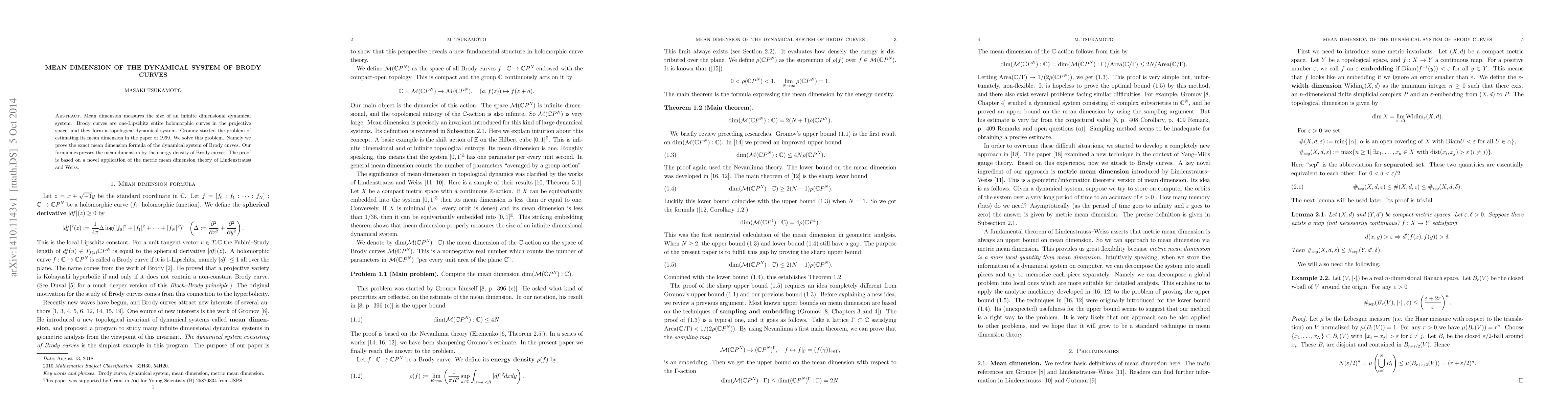 Mean dimension measures the size of an infinite dimensional dynamical system. Brody curves are one-Lipschitz entire holomorphic curves in the projective space, and they form a topological dynamical system. Gromov started the problem of estimating its mean dimension in the paper of 1999. We solve this problem. Namely we prove the exact mean dimension formula of the dynamical system of Brody curves. Our formula expresses the mean dimension by the energy density of Brody curves. The proof is based on a novel application of the metric mean dimension theory of Lindenstrauss and Weiss.