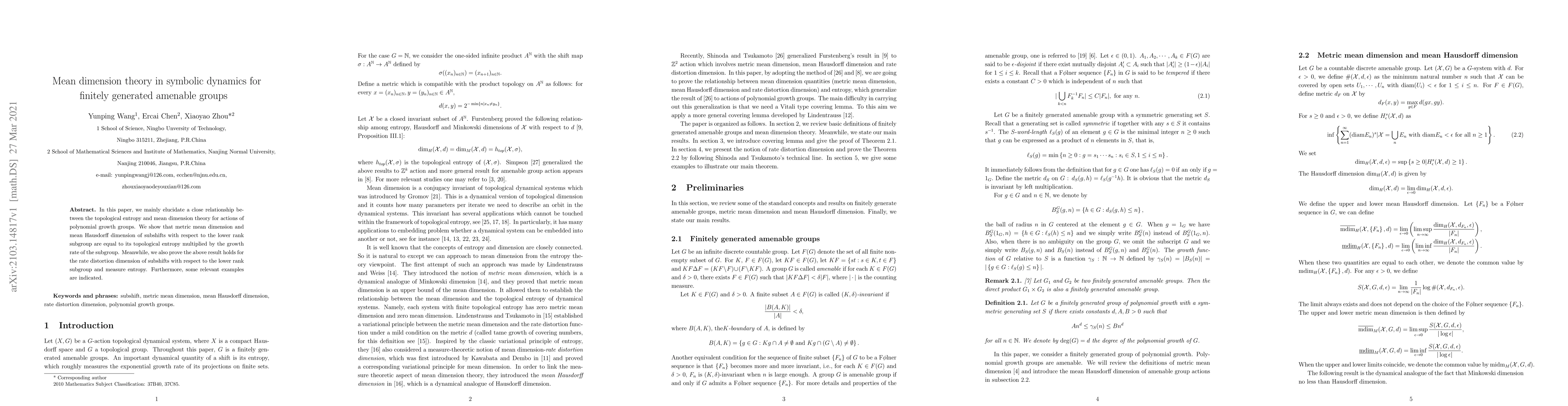 This paper explores the connection between topological entropy and mean dimension theory for actions of finitely generated amenable groups, demonstrating that the metric mean dimension and mean Hausdorff dimension of subshifts align with their topological entropy multiplied by the growth rate of the subgroup. It also proves similar results for rate distortion dimension and measure entropy, supplemented by relevant examples.