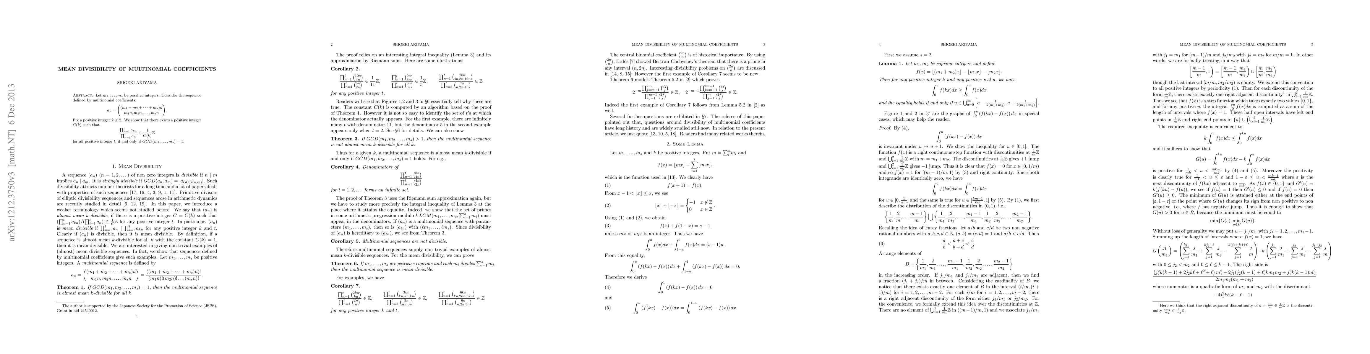 This paper investigates the mean divisibility of multinomial coefficients defined by a sequence \(a_n\). It proves that the ratio of products of these coefficients over multiples of n, normalized by a constant \(C(k)\), lies in \(\frac{1}{C(k)}\mathbb{Z}\) if and only if the greatest common divisor of \(m_1, ..., m_s\) is 1.