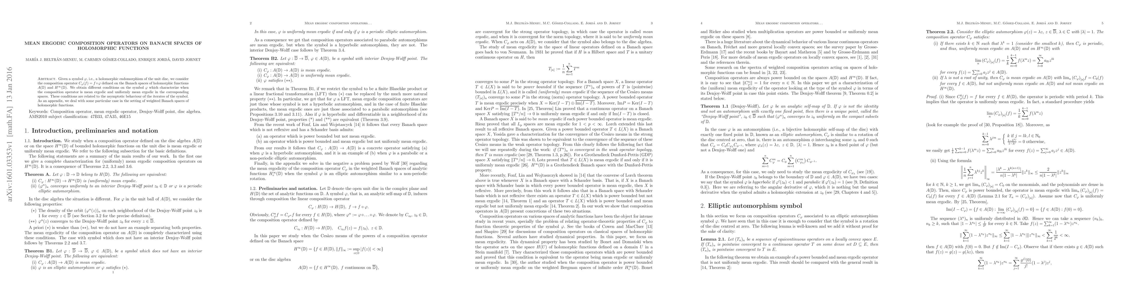 This paper investigates composition operators $C_{\varphi}$ on Banach spaces $A(\mathbb{D})$ and $H^{\infty}(\mathbb{D})$ of holomorphic functions, determining conditions under which these operators are mean ergodic and uniformly mean ergodic, based on the asymptotic behavior of the symbol $\varphi$. An appendix explores special cases in weighted Banach spaces.