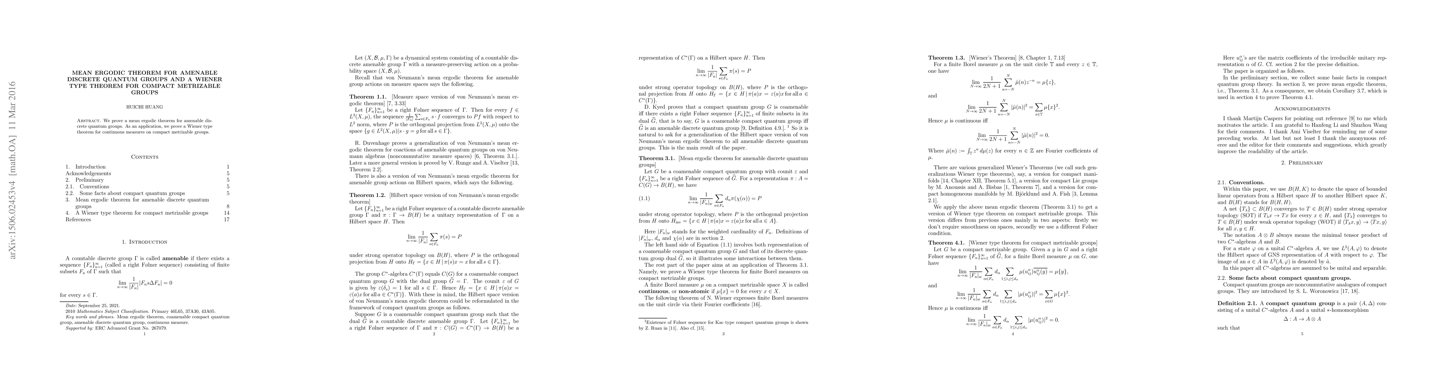 Summary: This paper establishes a mean ergodic theorem for amenable discrete quantum groups. It then applies this theorem to prove a Wiener type theorem concerning continuous measures on compact metrizable groups.