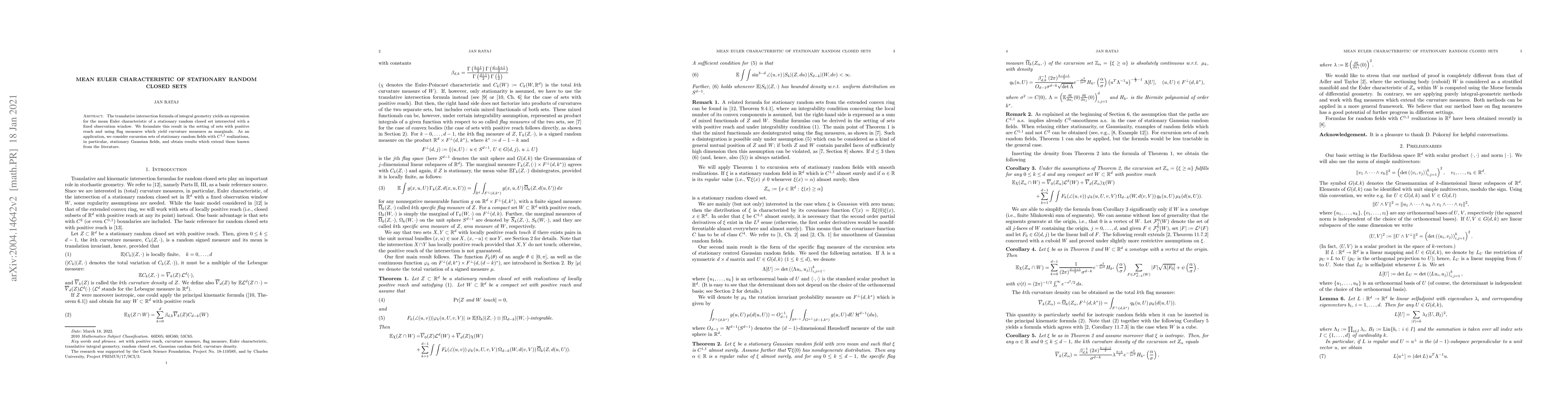 This paper derives an expression for the mean Euler characteristic of stationary random closed sets intersected with a fixed observation window, utilizing translative intersection formulas and flag measures. It extends existing results by applying the theory to excursion sets of stationary Gaussian fields.