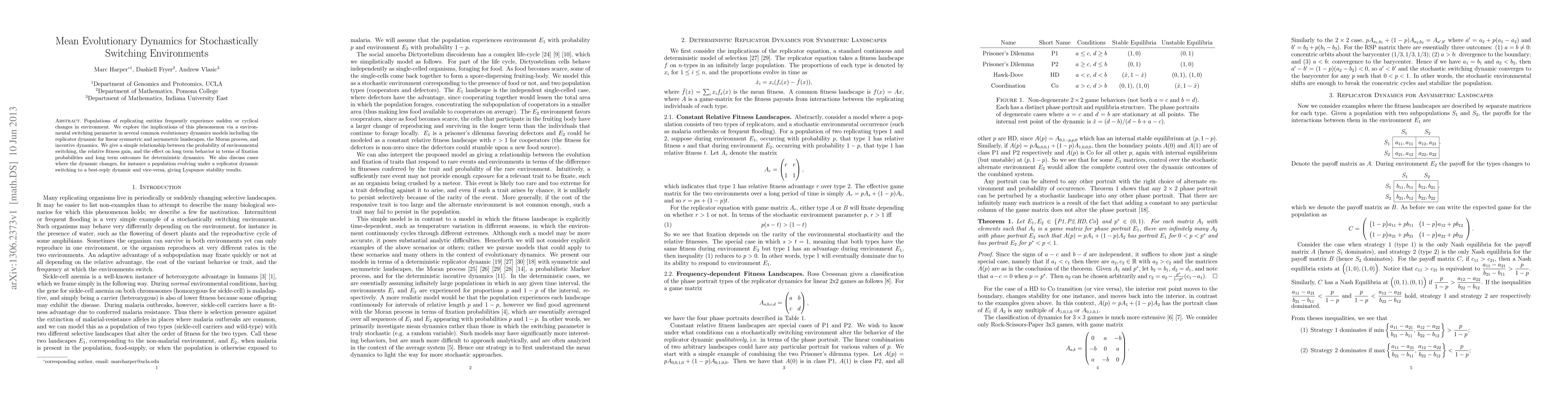The paper presents a comprehensive analysis of evolutionary dynamics under stochastic environmental switching, providing a theorem that connects different phase portraits via stochastic landscapes and stability results for dynamic changes.