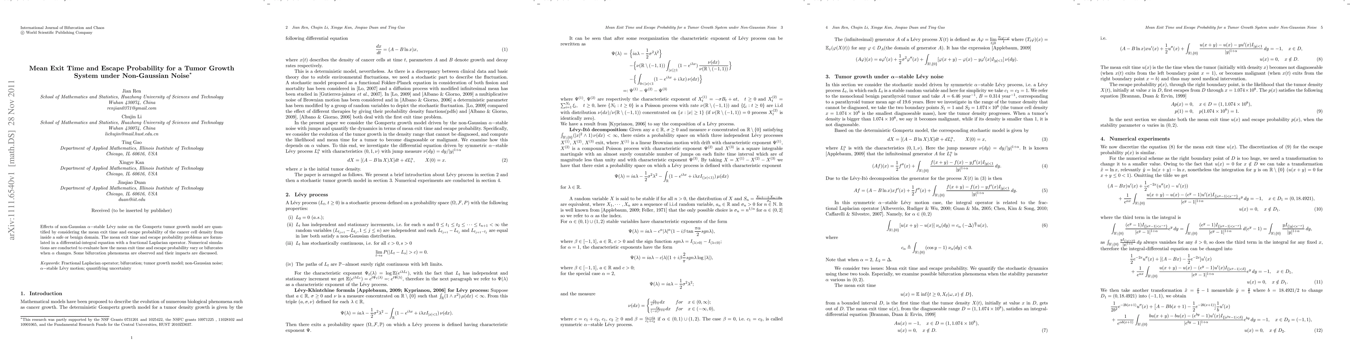 Effects of non-Gaussian $\alpha-$stable L\'evy noise on the Gompertz tumor growth model are quantified by considering the mean exit time and escape probability of the cancer cell density from inside a safe or benign domain. The mean exit time and escape probability problems are formulated in a differential-integral equation with a fractional Laplacian operator. Numerical simulations are conducted to evaluate how the mean exit time and escape probability vary or bifurcates when $\alpha$ changes. Some bifurcation phenomena are observed and their impacts are discussed.