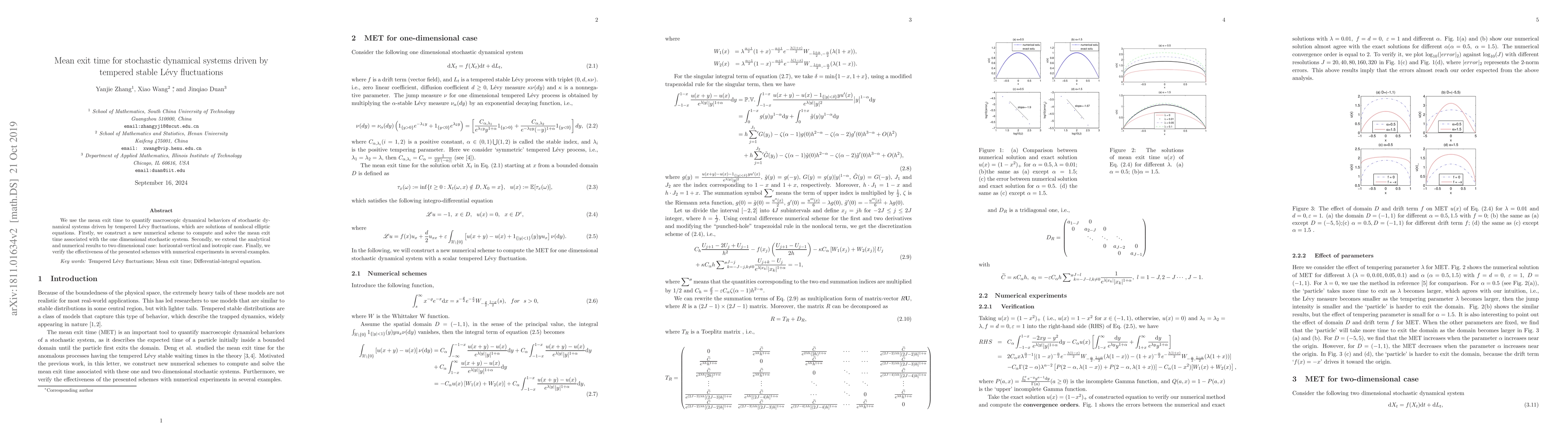 We use the mean exit time to quantify macroscopic dynamical behaviors of stochastic dynamical systems driven by tempered L\'evy fluctuations, which are solutions of nonlocal elliptic equations. Firstly, we construct a new numerical scheme to compute and solve the mean exit time associated with the one dimensional stochastic system. Secondly, we extend the analytical and numerical results to two dimensional case: horizontal-vertical and isotropic case. Finally, we verify the effectiveness of the presented schemes with numerical experiments in several examples.
