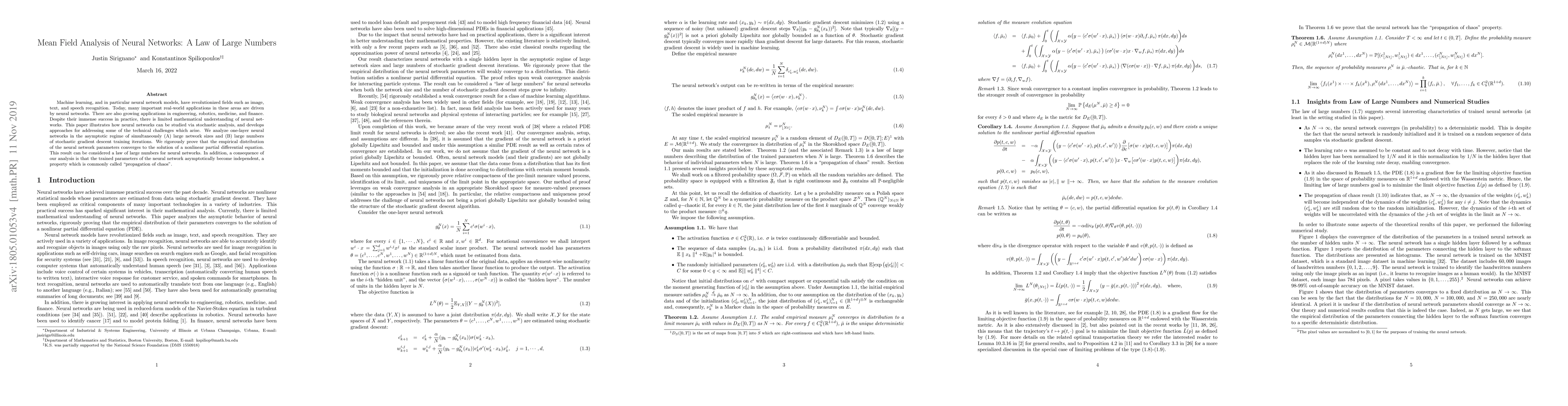 Machine learning, and in particular neural network models, have revolutionized fields such as image, text, and speech recognition. Today, many important real-world applications in these areas are driven by neural networks. There are also growing applications in engineering, robotics, medicine, and finance. Despite their immense success in practice, there is limited mathematical understanding of neural networks. This paper illustrates how neural networks can be studied via stochastic analysis, and develops approaches for addressing some of the technical challenges which arise. We analyze one-layer neural networks in the asymptotic regime of simultaneously (A) large network sizes and (B) large numbers of stochastic gradient descent training iterations. We rigorously prove that the empirical distribution of the neural network parameters converges to the solution of a nonlinear partial differential equation. This result can be considered a law of large numbers for neural networks. In addition, a consequence of our analysis is that the trained parameters of the neural network asymptotically become independent, a property which is commonly called "propagation of chaos".