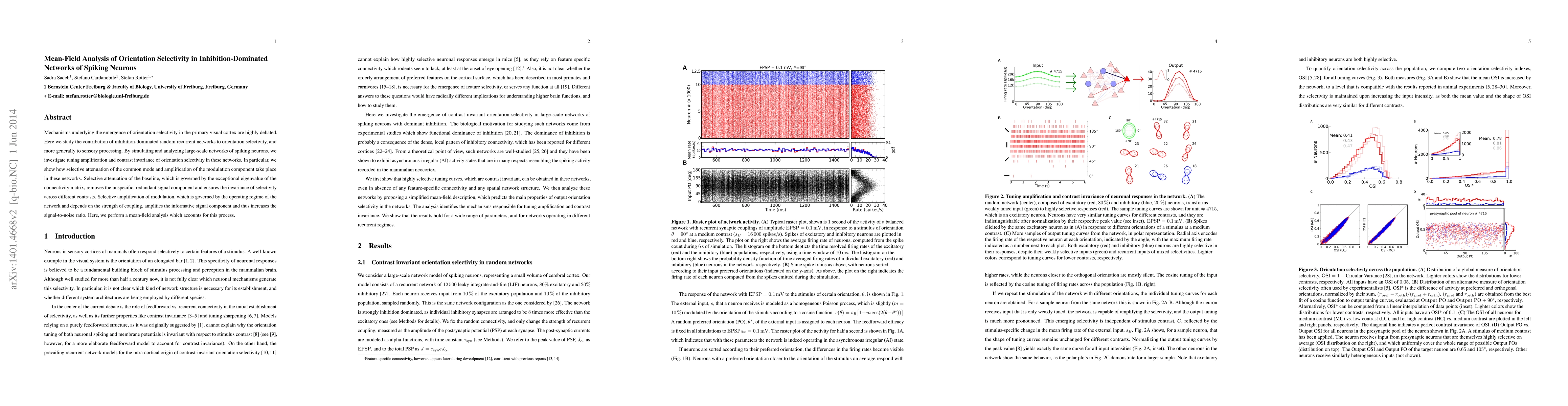 This paper explores how inhibition-dominated networks of spiking neurons contribute to orientation selectivity in the primary visual cortex. It demonstrates through mean-field analysis that selective attenuation of the baseline and amplification of modulation components enhance orientation selectivity and contrast invariance.