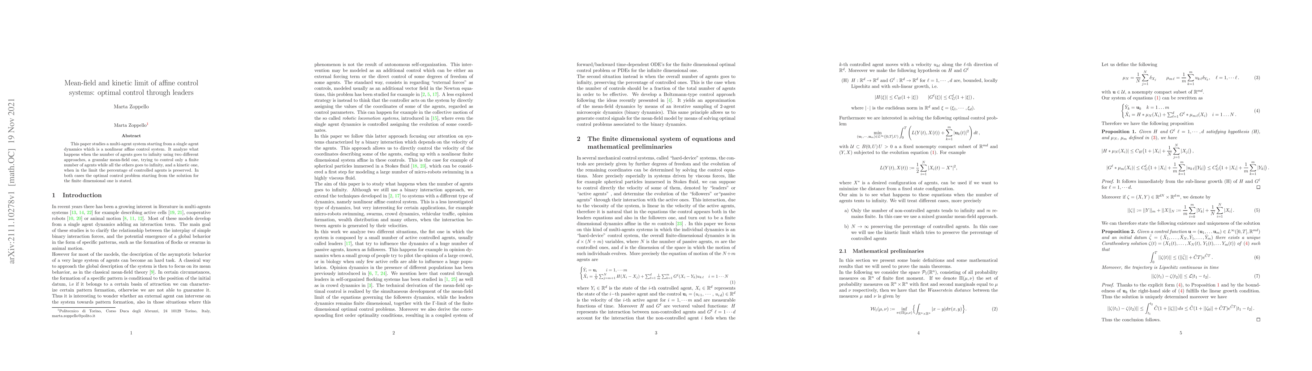 This paper studies a multi-agent system starting from a single agent dynamics which is a nonlinear affine control system. It analyze what happens when the number of agents goes to infinity using two different approaches, a granular mean-field one, trying to control only a finite number of agents while all the others goes to infinity, and a kinetic one, when in the limit the percentage of controlled agents is preserved. In both cases the optimal control problem starting from the solution for the finite dimensional one is stated.