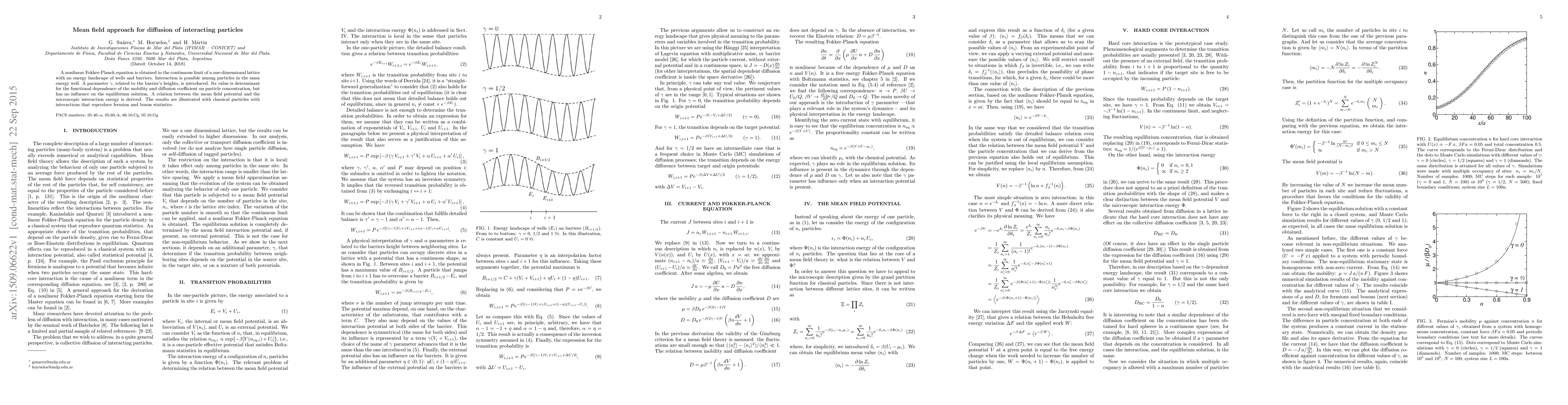 A nonlinear Fokker-Planck equation is obtained in the continuous limit of a one-dimensional lattice with an energy landscape of wells and barriers. Interaction is possible among particles in the same energy well. A parameter $\gamma$, related to the barrier's heights, is introduced. Its value is determinant for the functional dependence of the mobility and diffusion coefficient on particle concentration, but has no influence on the equilibrium solution. A relation between the mean field potential and the microscopic interaction energy is derived. The results are illustrated with classical particles with interactions that reproduce fermion and boson statistics.