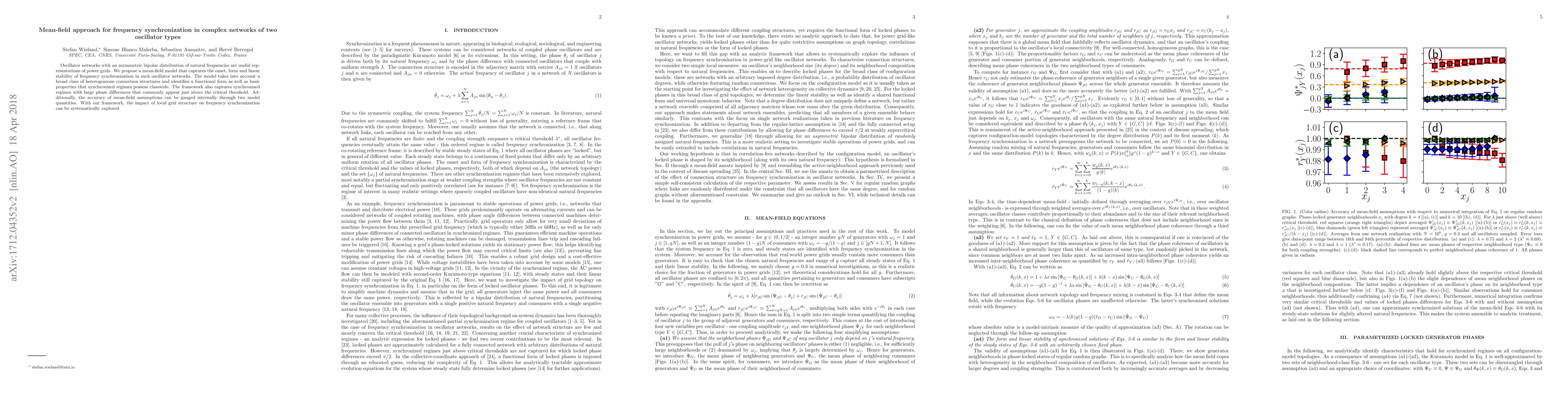 This paper proposes a mean-field model to study frequency synchronization in complex networks of two types of oscillators, analogous to power grids. The model identifies the conditions and properties of synchronized regimes, including those with large phase differences, and assesses the accuracy of mean-field assumptions internally.