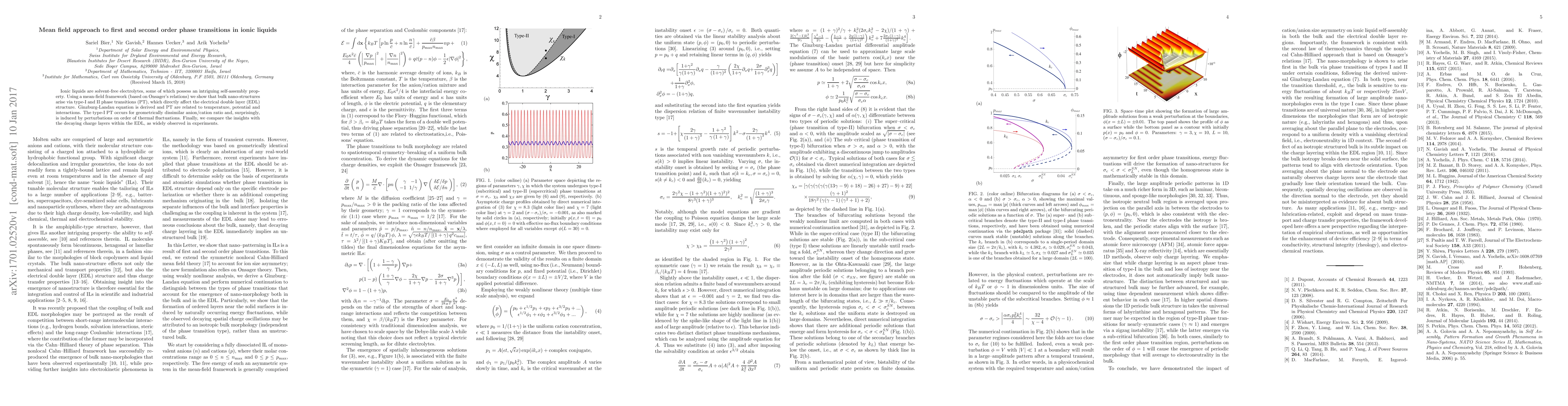 Ionic liquids are solvent-free electrolytes, some of which possess an intriguing self-assembly property. Using a mean-field framework (based on Onsager's relations) we show that bulk nano-structures arise via type-I and II phase transitions (PT), which directly affect the electrical double layer (EDL) structure. Ginzburg-Landau equation is derived and PT are related to temperature, potential and interactions. The type-I PT occurs for geometrically dissimilar anion/cation ratio and, surprisingly, is induced by perturbations on order of thermal fluctuations. Finally, we compare the insights with the decaying charge layers within the EDL, as widely observed in experiments.