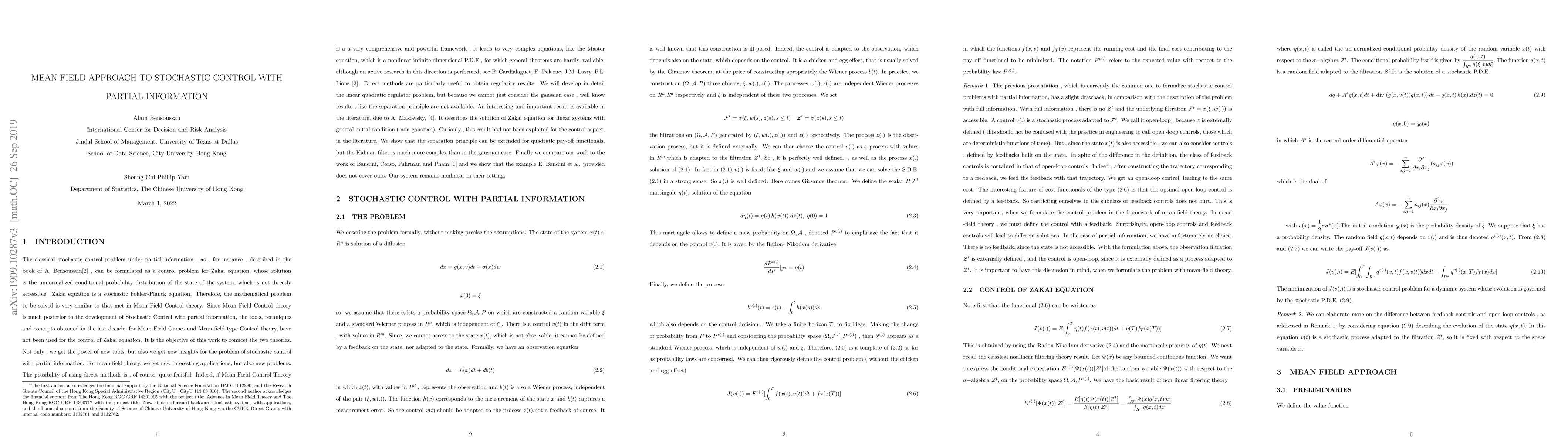 The classical stochastic control problem under partial information can be formulated as a control problem for Zakai equation, whose solution is the unnormalized conditional probability distribution of the state of the system. Zakai equation is a stochastic Fokker-Planck equation. Therefore, the problem to be solved is similar to that met in Mean Field Control theory. Since Mean Field Control theory is much posterior to the development of Stochastic Control with partial information, the tools, techniques, and concepts obtained in the last decade, for Mean Field Games and Mean field type Control theory, have not been used for the control of Zakai equation. Our objective is to connect the two theories. We get the power of new tools, and we get new insights for the problem of stochastic control with partial information. For mean field theory, we get new interesting applications, but also new problems. Indeed, Mean Field Control Theory leads to very complex equations, like the Master equation, which is a nonlinear infinite dimensional P.D.E., for which general theorems are hardly available, although active research in this direction is performed. Direct methods are useful to obtain regularity results. We will develop in detail the LQ regulator problem, but since we cannot just consider the Gaussian case, well-known results, such as the separation principle is not available. An important result is available in the literature, due to A. Makowsky. It describes the solution of Zakai equation for linear systems with general initial condition (non-gaussian). We show that the separation principle can be extended for quadratic pay-off functionals, but the Kalman filter is much more complex than in the gaussian case. Finally we compare our work to the work of E. Bandini et al. and we show that the example E. Bandini et al. provided does not cover ours. Our system remains nonlinear in their setting.