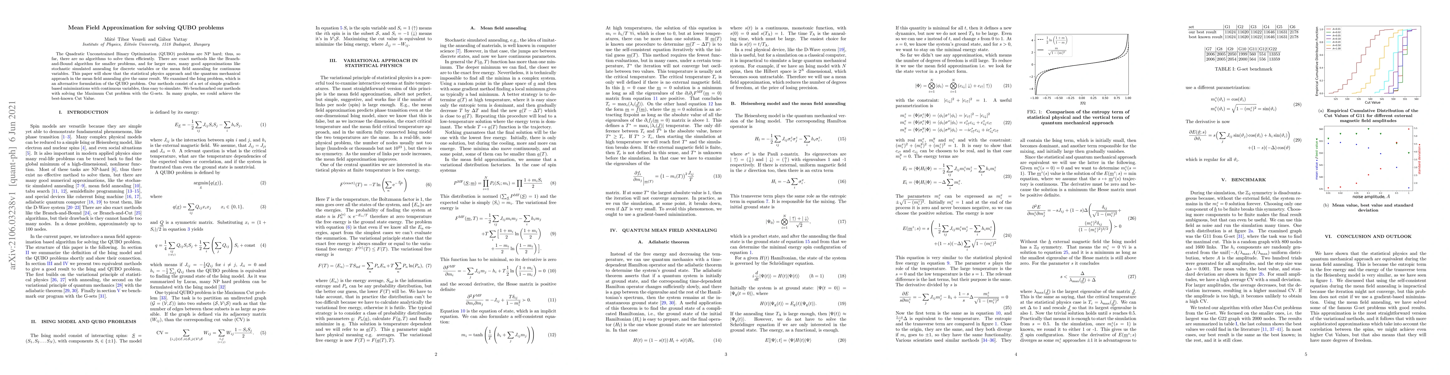 This paper proposes a mean field approximation method for solving NP-hard QUBO problems, demonstrating equivalence between statistical physics and quantum mechanical approaches. The method uses gradient-based minimizations and achieved the best-known Maximum Cut values on benchmarked G-sets.
