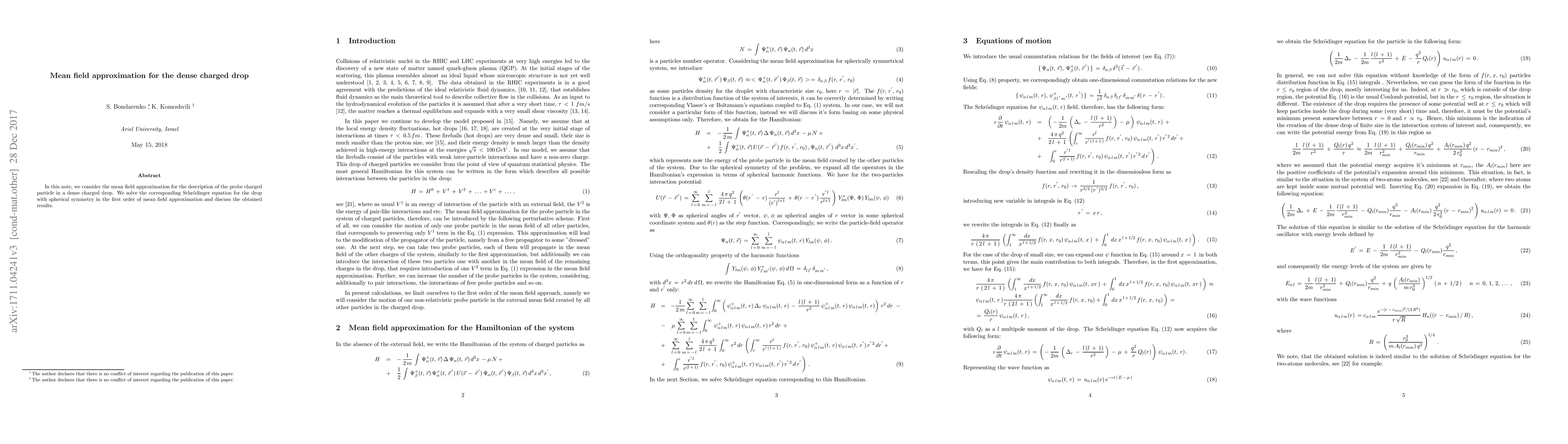 In this note, we consider the mean field approximation for the description of the probe charged particle in a dense charged drop. We solve the corresponding Schr\"{o}dinger equation for the drop with spherical symmetry in the first order of mean field approximation and discuss the obtained results.