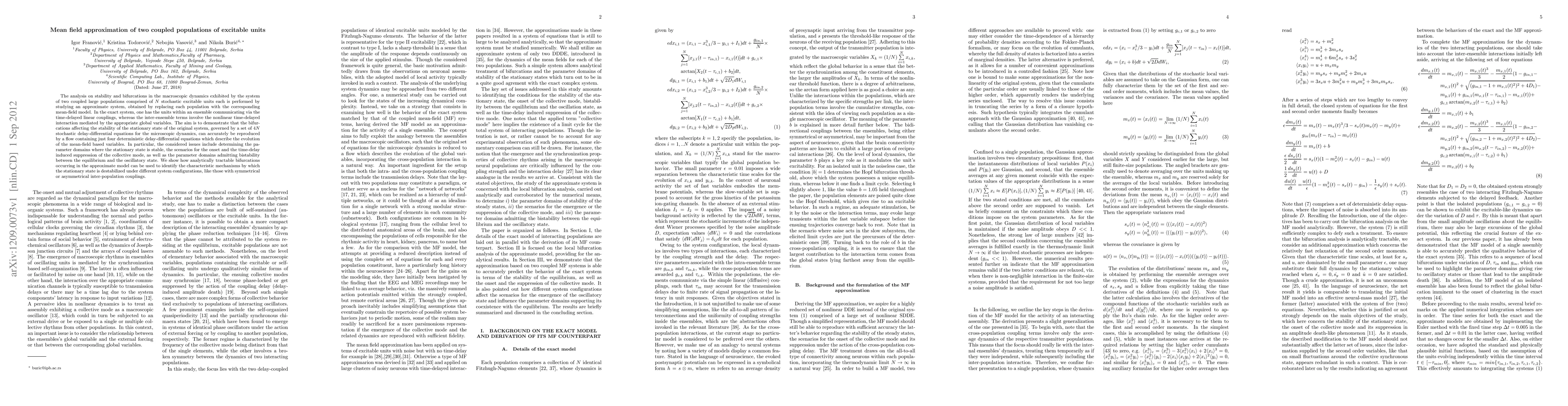 This paper investigates the stability and bifurcations in a system of two coupled large populations of stochastic excitable units using mean-field approximation. It demonstrates that the bifurcations in the original system can be accurately reproduced by a simplified model with four deterministic delay-differential equations.